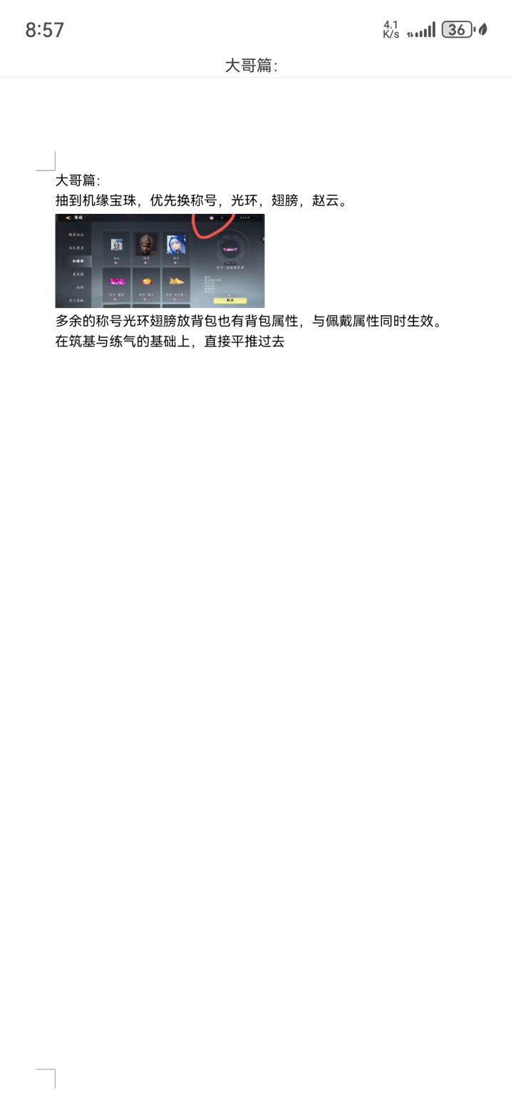 大哥篇:抽到机缘宝珠,优先换称号,光环,翅膀,赵云。多余的称号光环翅膀放背包也有背包属性,与佩戴属性同时生效。在筑基与练气的基础上,直接平推过去