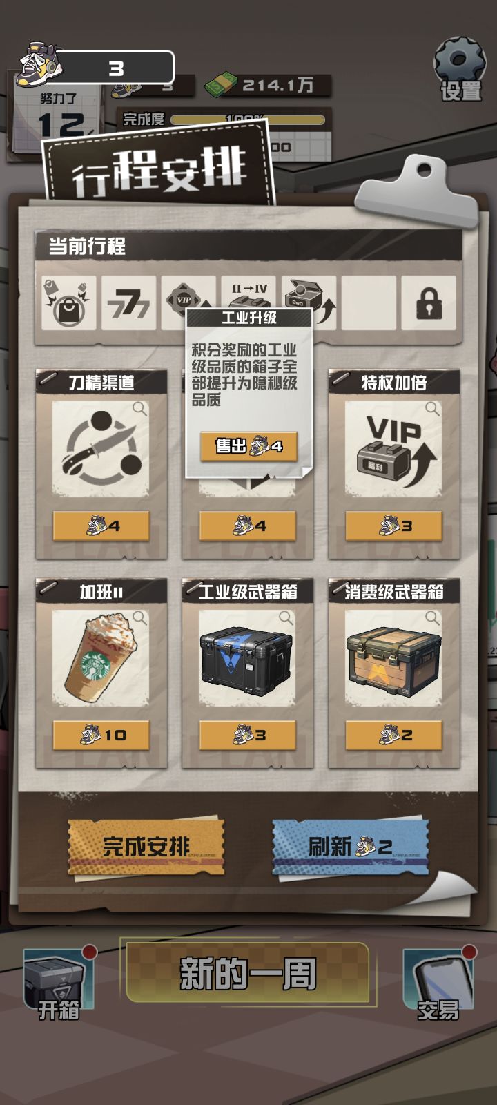 核心回头客(每周第1件出售的商品会直接出售,第二个)+巨龙(忘了叫啥了,第五个)前期电表倒刷攒资金(第一个和第四个行程),然后去市场买高价的皮肤,双倍卖出,此时最低赚你买的价格少一点。后期看见巨龙直接入手,放到库里,吃行程的增益。(也可以宝箱刷)我最后一把纪念龙狙,收益1.4亿