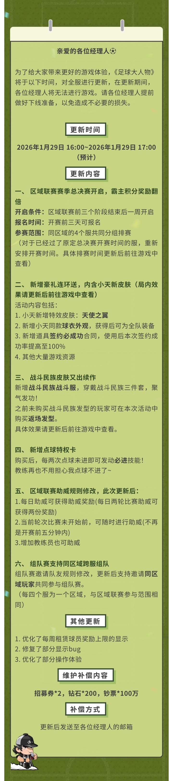 亲爱的各位经理人: 为了给大家带来更好的游戏体验,《足球大人物》将于以下时间,对全服进行更新,在更新期间,各位经理人将无法进行游戏。请各位经理人提前做好下线准备,以免造成不必要的损失。 【更新时间】2026年1月23日 16:00~2026年1月23日 17:00(预计) 【更新内容】一、新增比赛:区域超级杯1. 参赛方式1)开启范围:球王1-8服抢先开启体验(其他服务器预计下周开赛