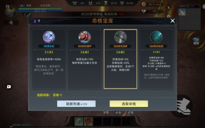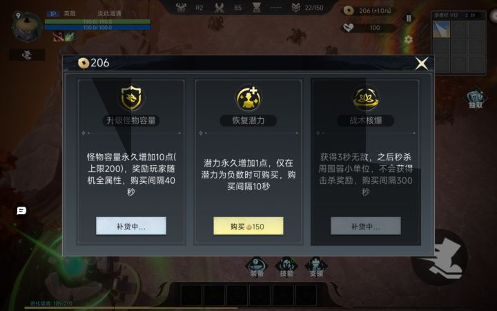 开局第一个boss先购买右下角,支援,升级怪物容量,提升三维属性,第一个或者第二个命格必须刷出杀敌增加三维属性的命格,仙玉。泰坦,焰团扇,打难度6以上开局2个命格必须刷出这个,或者商城无脑充值,随便碾压,游戏可玩性还是挺高的,用来打发时间,打过图了挺有成就感的
