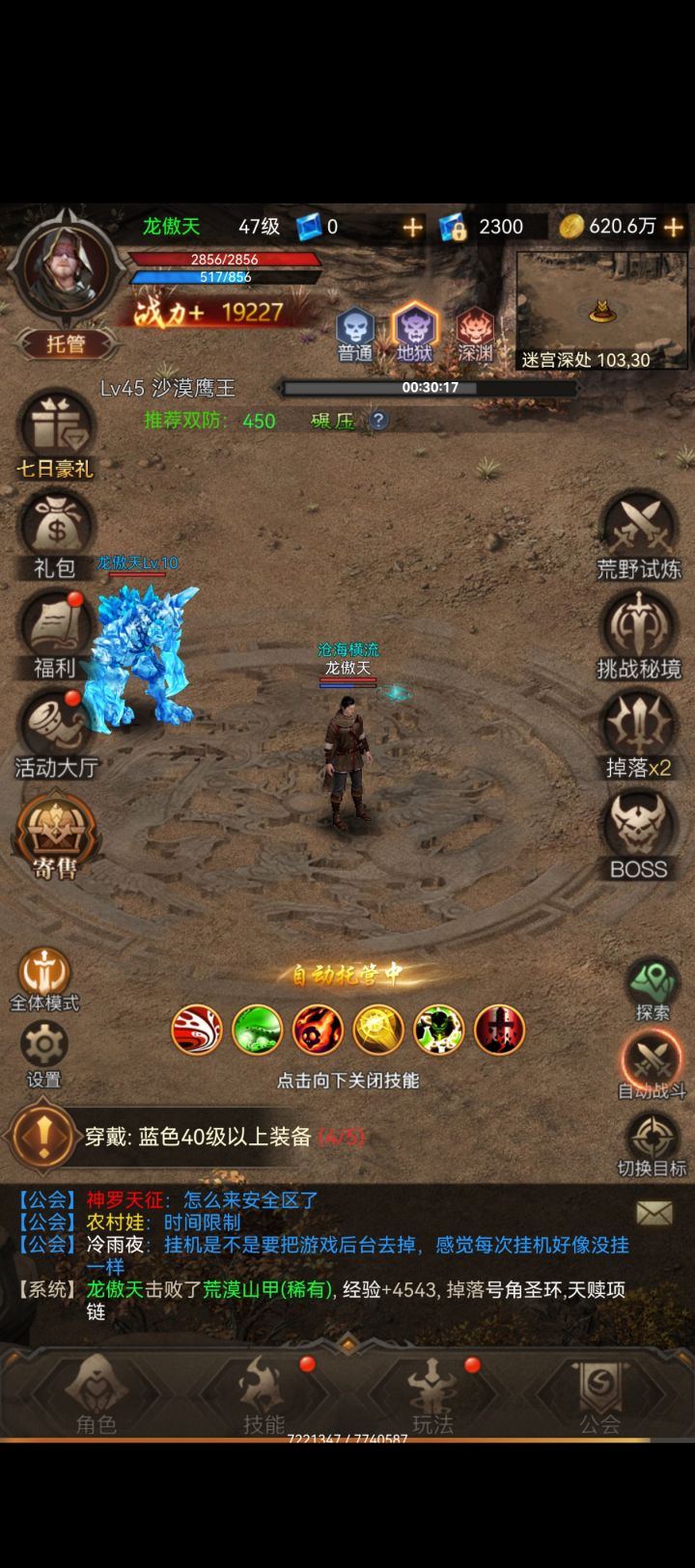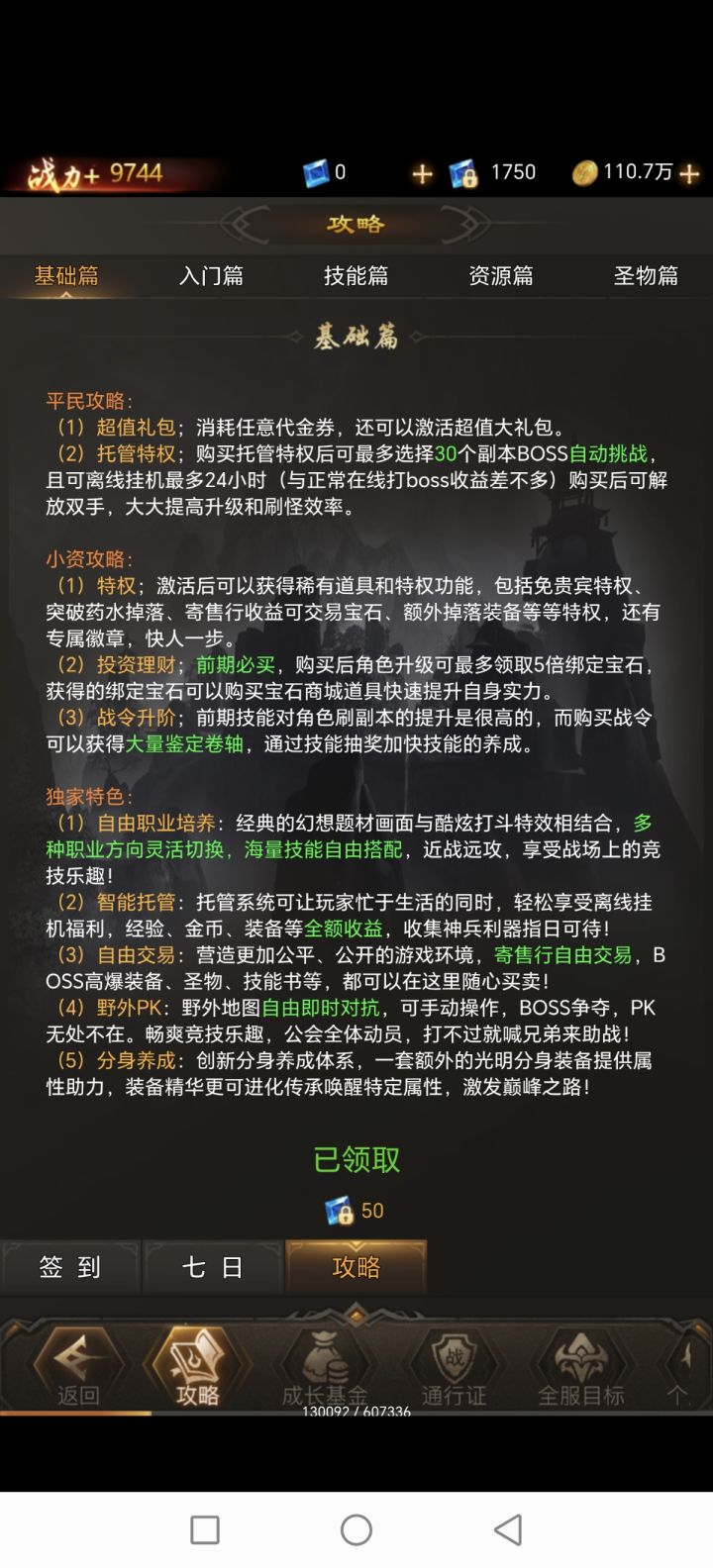 1:开局跟着任务走,一直打到自己打不动为止,前期背包空间不够,可以把低级的蓝色以下的装备自动回收了,紫色的可以留着开图鉴。2:当你把任务做完了,等级应该在40多级了,可以离线托管或者去杀戮空间打装备,不过里面可以自由pk,小心被杀了。3:白嫖玩家或者小氪钻石不要乱花,留着开特权,2级特权可以打boos掉落突破药水,非常缺突破药水,技能10级就要100个突破药水,没有开通2级特权,所有的技能基本