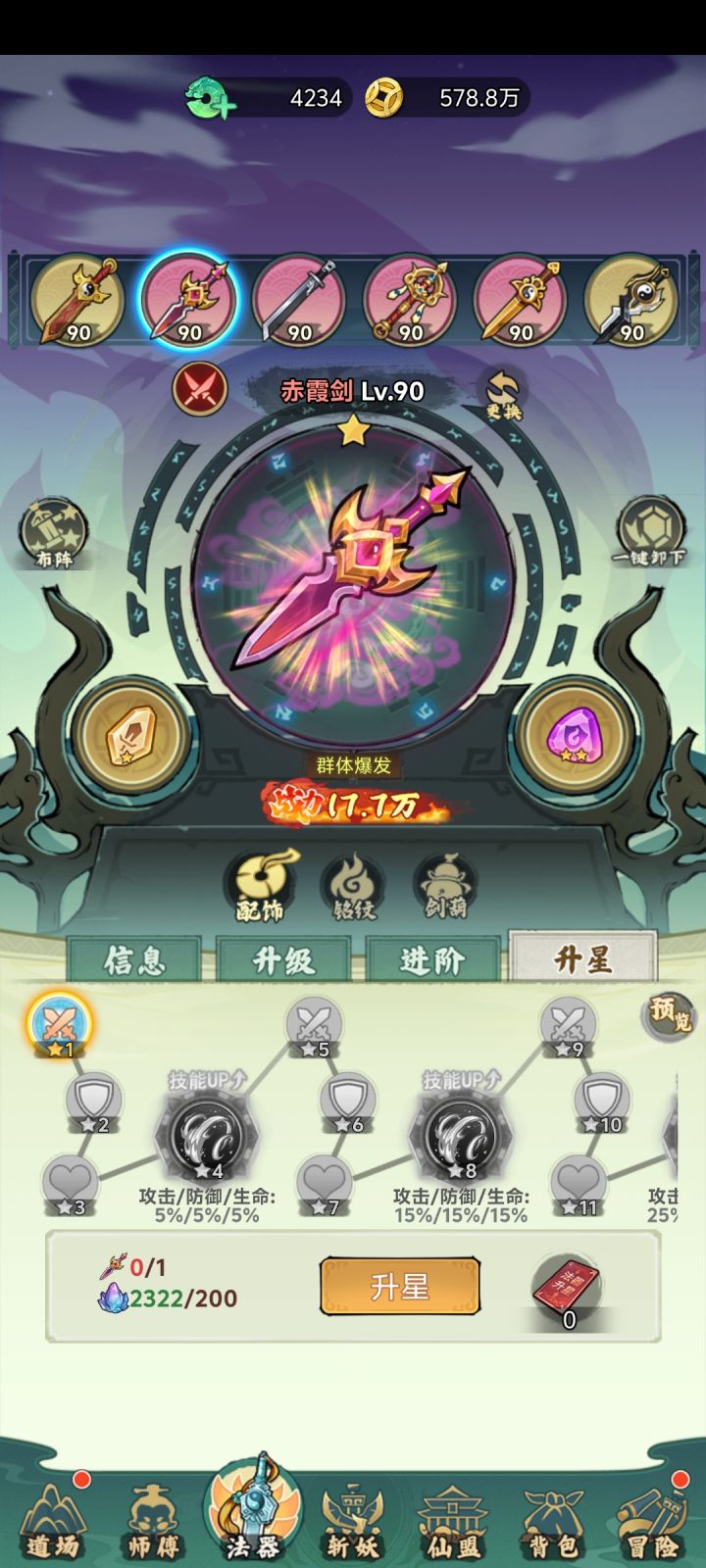 法器升星只能在上场的时候可以升星,在仓库点开法器不能升星,建议优化一个点开法器就有一个升星界面,有时候换武器和分解的时候交互会有点麻烦有些可玩性还是很多的,不会太枯燥,希望玩的人越来越多#发现好游戏 #浅评一下 #御剑九宫 #游戏日常 #今天游戏圈发生了啥