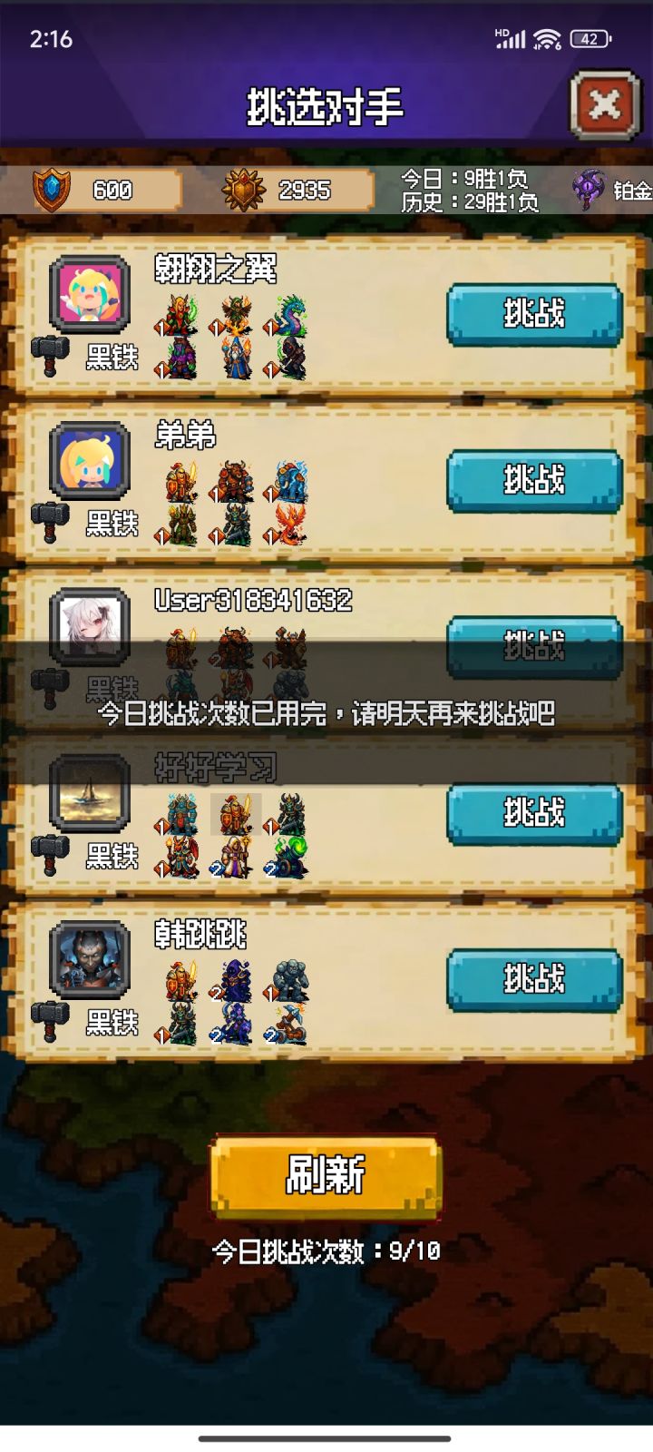 点进竞技场然后点❌有概率发生的事情,不过估计概率不高,会导致你进去了点了❌之后就直接挑战别人然后你在点❌就会直接失败,但是如果你打了你能赢第一场但是第二场会显示数据异常,然后你在直接退出就会扣除一次挑战机会,然后就会和我这样显示还差一次但是打不了红点也不会消失