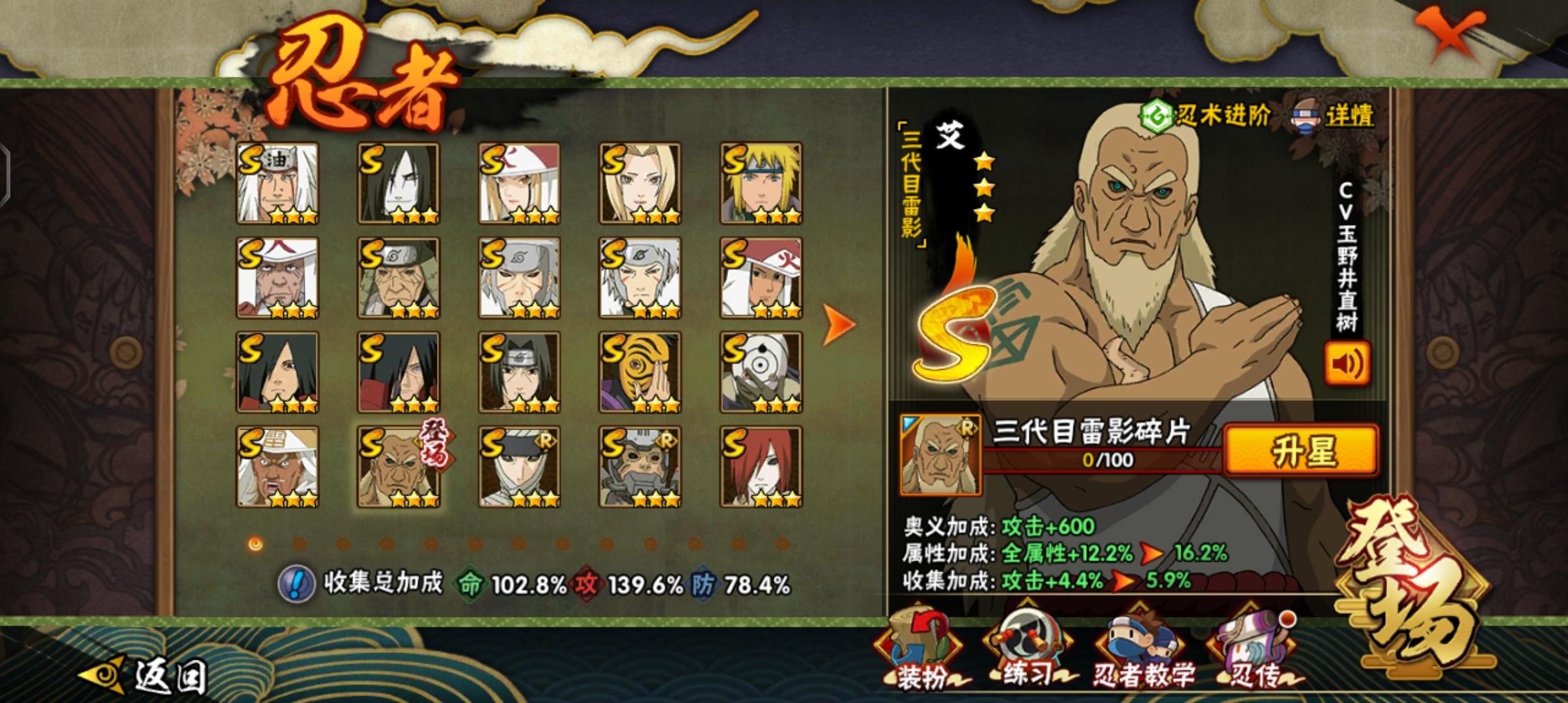 手上有个不咋地的号,三代雷影再不斩,鹰佐,就这点东西,战力排名30,没时间玩了,来个人代肝