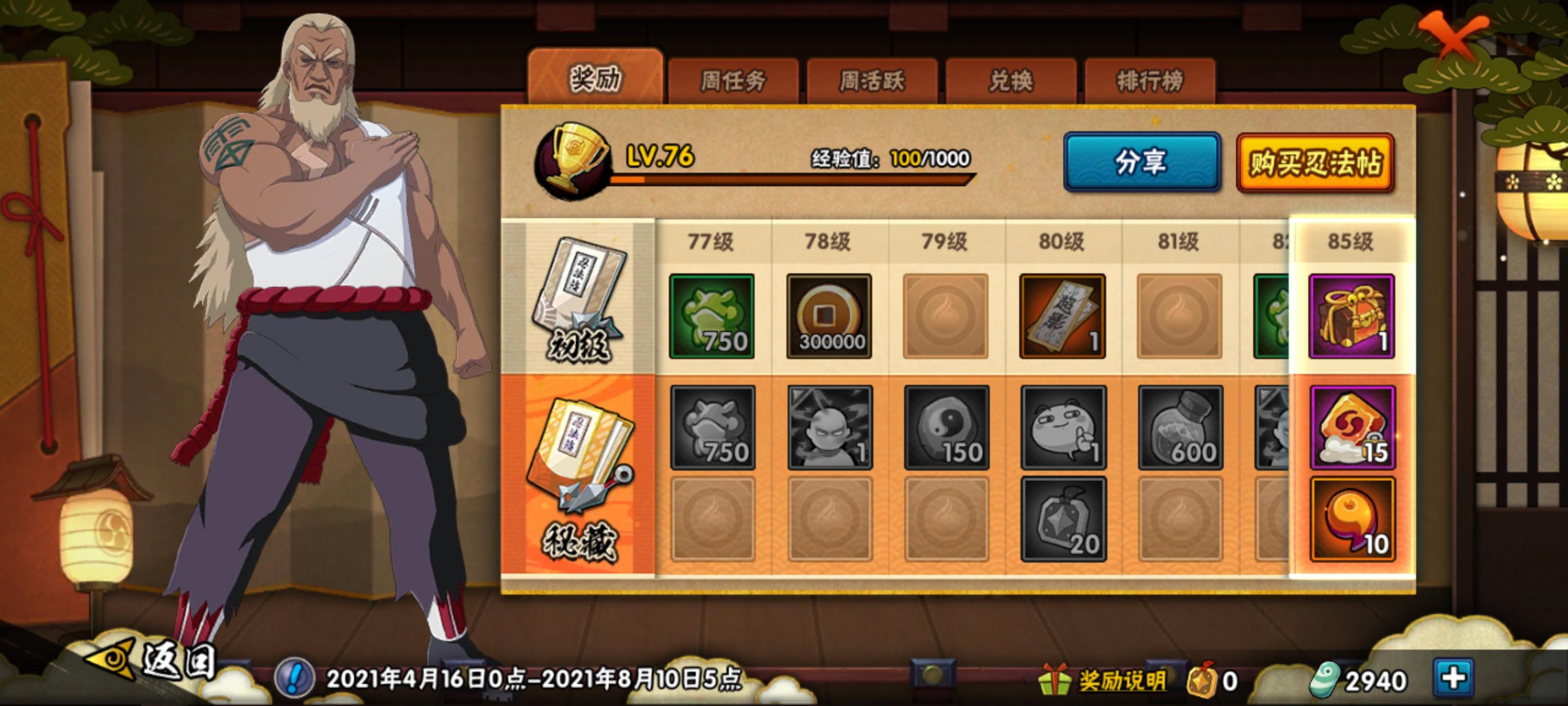 各位帮我考虑一下,现在加上金币一共是150抽,然后我三代是85片,然后昨天忍法帖还给了七天超影,我秽土斑37片,我是在攒攒等七月a还是把三代弄出来,我现在金币是9千多,刚刚算了一下弄三代在特权得花8千多,各位帮我出出主意搞还是不搞