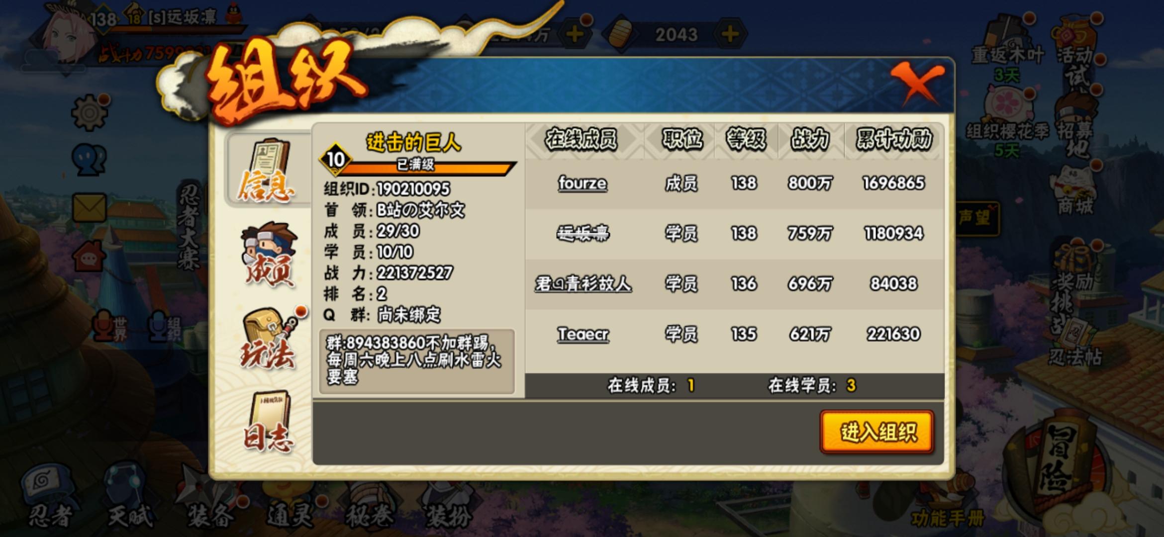 找个人帮忙继承一下火之意志,学业比较重不能打组织活动,找个人帮忙做做组织活动,因为是刷攻击所以排名在五十名左右,实际上打得过四十名的人,忍者还行,有想法的加我聊吧
