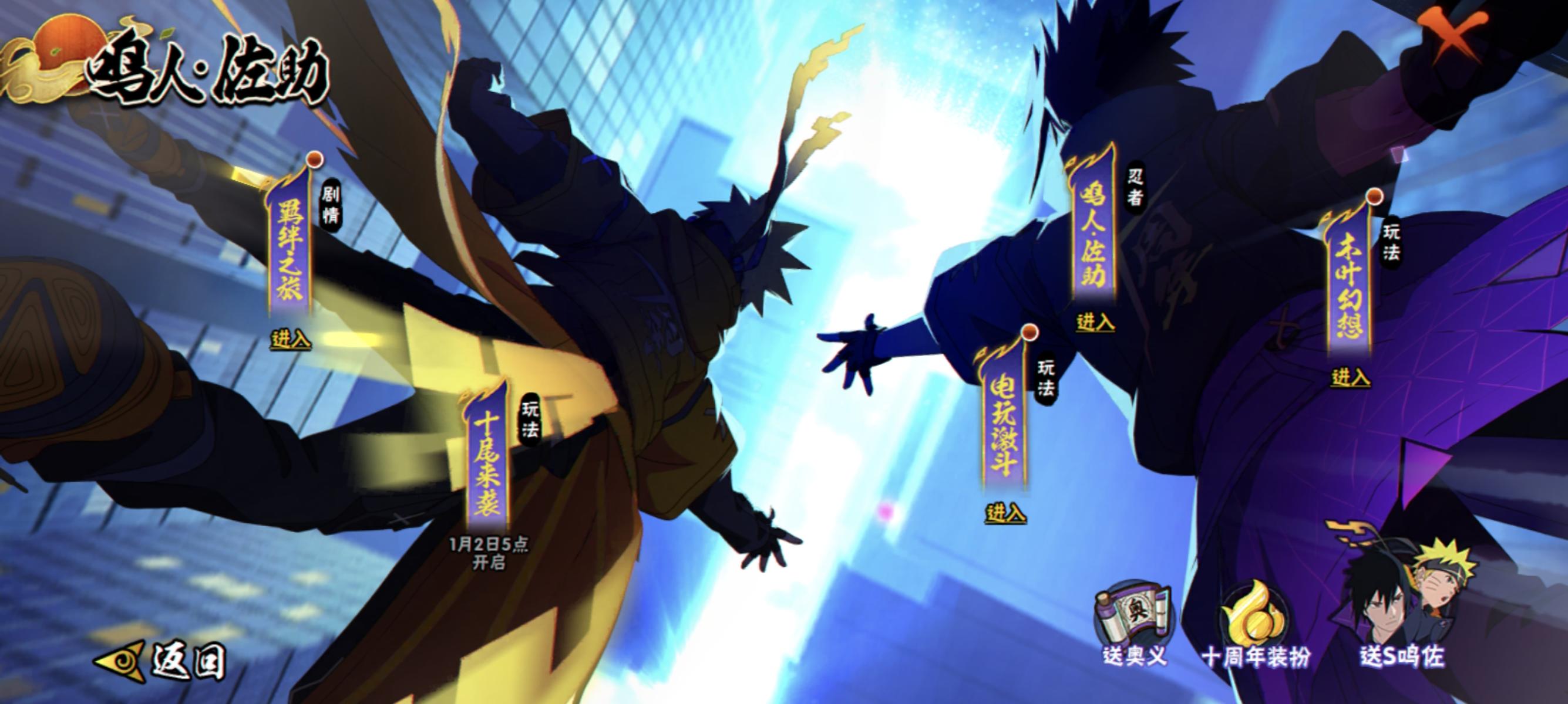 在“送忍者鸣人佐助”的界面里,点击“十周年装扮”,然后点击“一键卸下”。真的服了,策划把功能藏在这里找了半天。这个决斗场UI整得很难受,特别是那个血条,斜着怎么看怎么别扭。