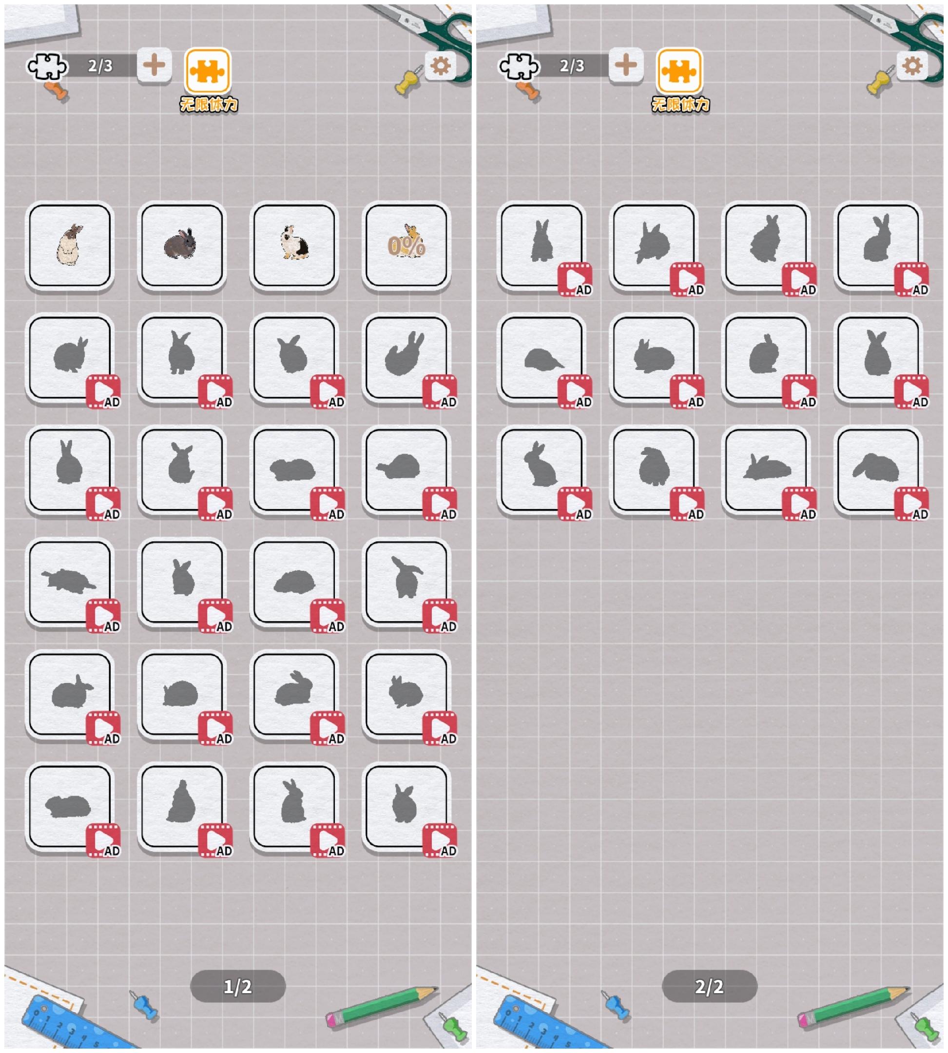 🌃画面:是一堆可爱的小兔兔组成的游戏!(确信)好可爱!这些兔兔的画风有点写实,但也是个很萌的画风!🎮可玩性:是兔兔拼图!但是是无规则图形的那种高难度拼图,还有时间限制,不过幸好可以看广告打消限制,体力也是。这样看来这个游戏还是可以的~游戏难度也还是很有的,但是慢慢来总能完成的~反正我喜欢这个游戏~🌟发帖存图,都玩~😈#发现好游戏 #游戏日常 #单机游戏 #挤在一