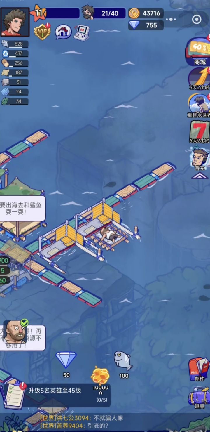 **《疯狂水世界》开荒攻略·新手入门篇**开局优先推图,首日力争突破70关,解锁挂机奖励中的稀缺资源“蓝图”。推图越快,资源获取越高效,徽章装备也与关卡进度挂钩。角色招募每50抽必出传说英雄,首日可获“一龙”,第二天送“大嘴山姆”,阵容成型快。建筑升级依赖蓝图,优先提升指挥中心,派遣高星英雄委托加速生产。善用VIP2特权,每日领取加速沙漏,刷贸易港口快速升级。零氪玩家建议激活首充6元+12元自