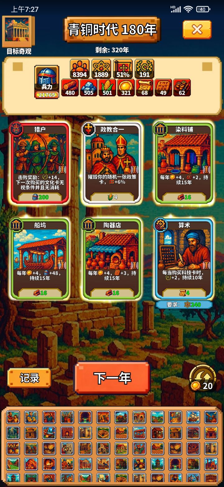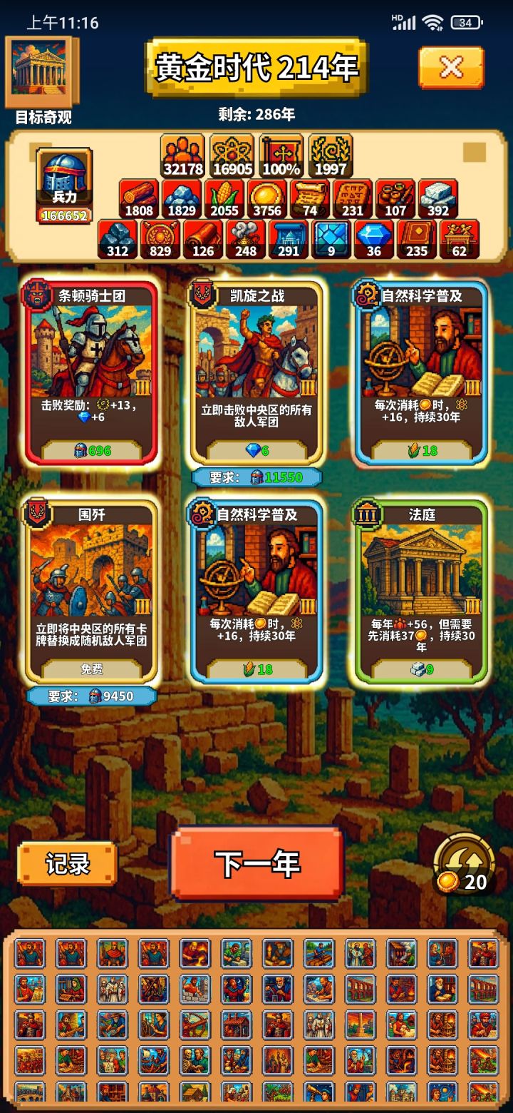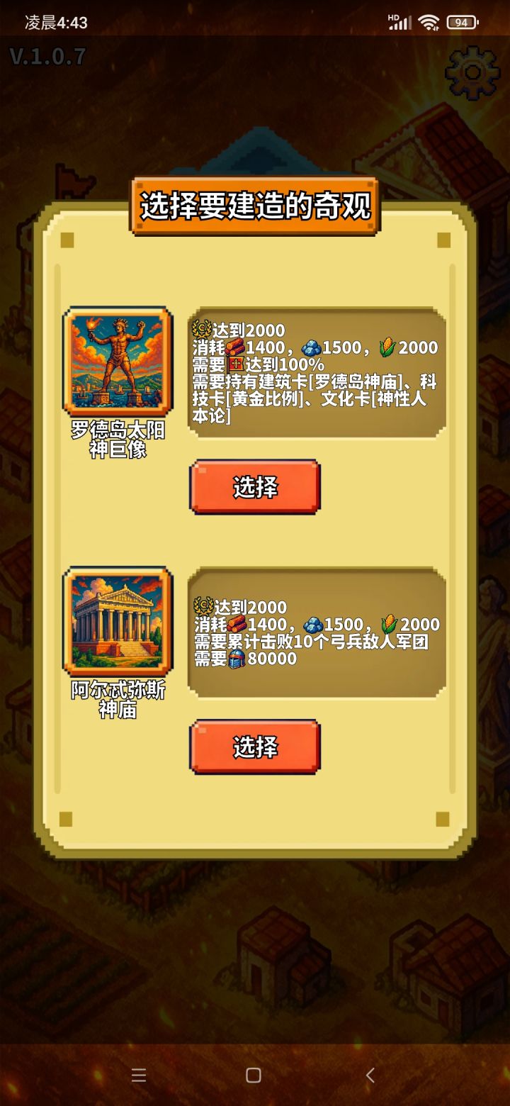 说实话,我玩这个游戏的主要原因就是看到评论区很多玩家觉得游戏难度过大所以感觉应该很有挑战性,昨天玩了一把熟悉了一下游戏规则,今天第二把就已经通关第一个难度了,所以来评论区给大家分享一下游戏心得。大家仔细观察会发现,不管开局选择建哪个建筑都必须花费1400木材1500矿石2000粮食,所以如何攒够这三种资源就是游戏的核心内容,至于难度的话我个人感觉我的截图当中那两个就是最简单的,其中阿尔忒弥斯神庙