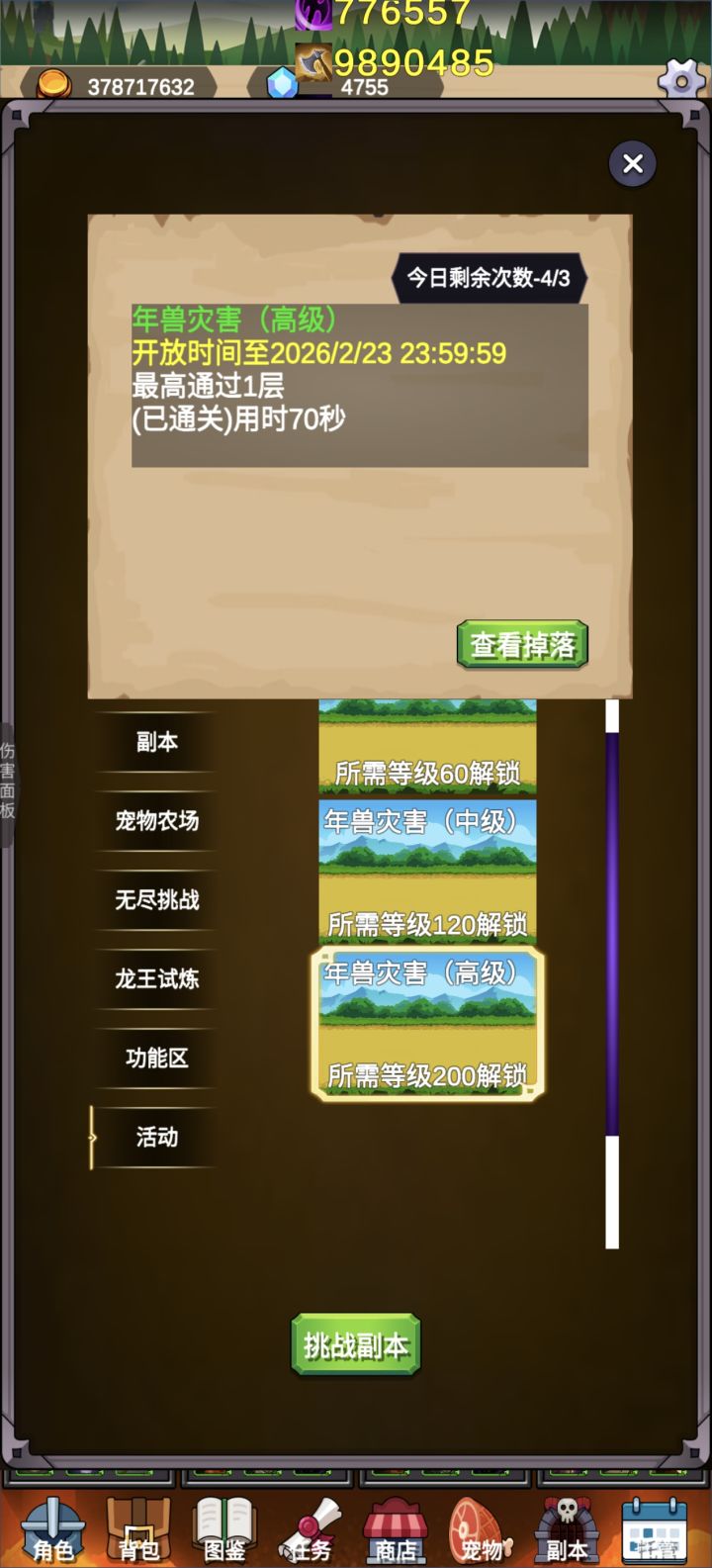 众所周知,进入年兽副本的方式是:副本-活动-选择自己喜欢的难度但是经过我的实践发现,团子的年兽副本进入条件判断逻辑设计的有点问题,具体逻辑这里不做解释了,我直接说如何无限刷年兽副本:进入年兽副本开始战斗后,再次打开副本选择页面,切换个别页面,比如普通副本或者宠物农场都行,手动选择个普通副本但是不进入副本,让该副本处于被选状态,但是当前战斗仍是年兽,就可以一直挂着啦,祝大家新年快乐!