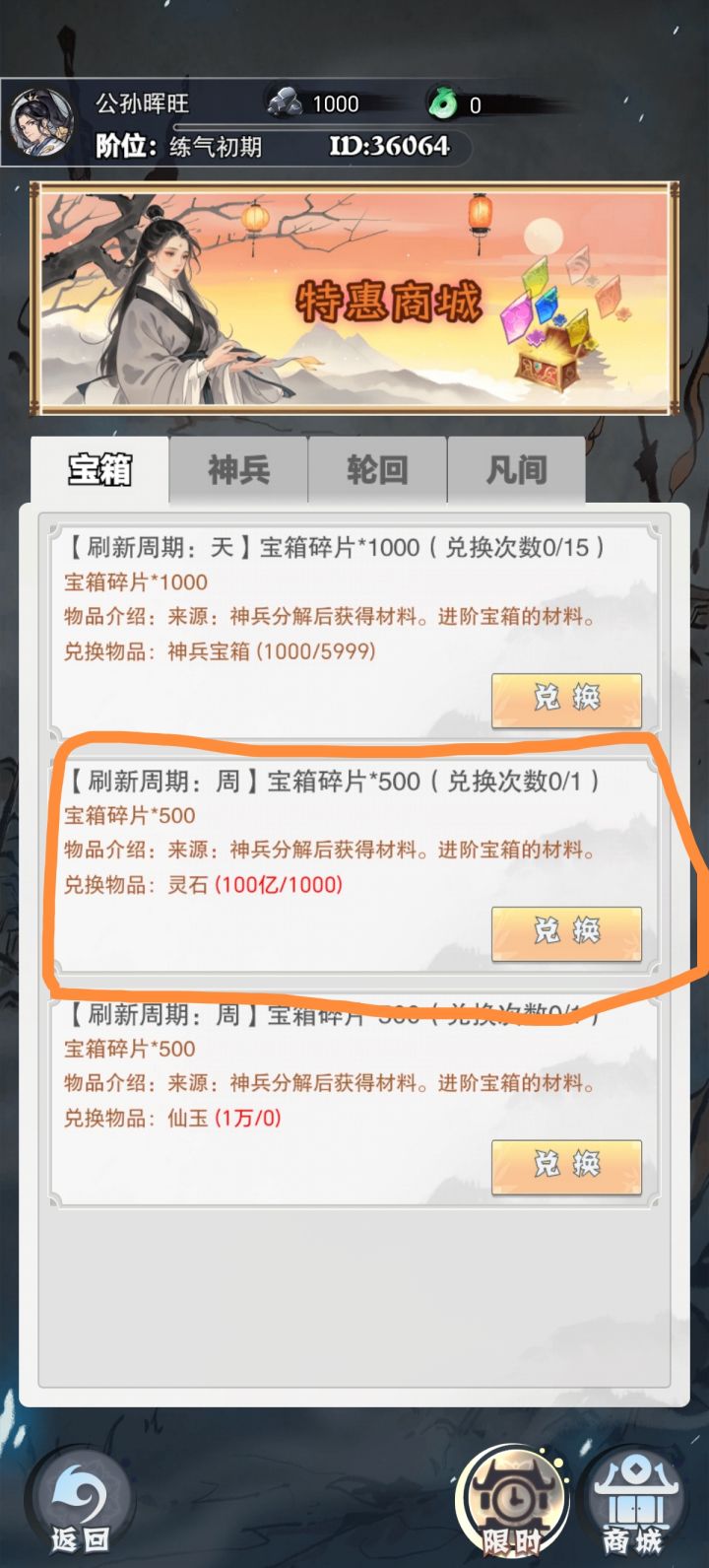 进入游戏,跟着步骤走灵宝箱子开了点激活了把羁绊洗出来1.过天宫打到1000关加速度卡有限制一次只有50不要全部用完,用10~20张就行然后在收菜2诸天不要着急占坑,把神兵强化啦一下战斗力箱子开一开提一提战斗力然后去打灵宝副本3重点每次轮回商店记得买东西要买什么截图有红色标记有,不要一股脑的全部买完,要适当所谓的加速卡,副本门票,诸天门票都不需要屯差什么在买什么4功法副本去打一下就行,