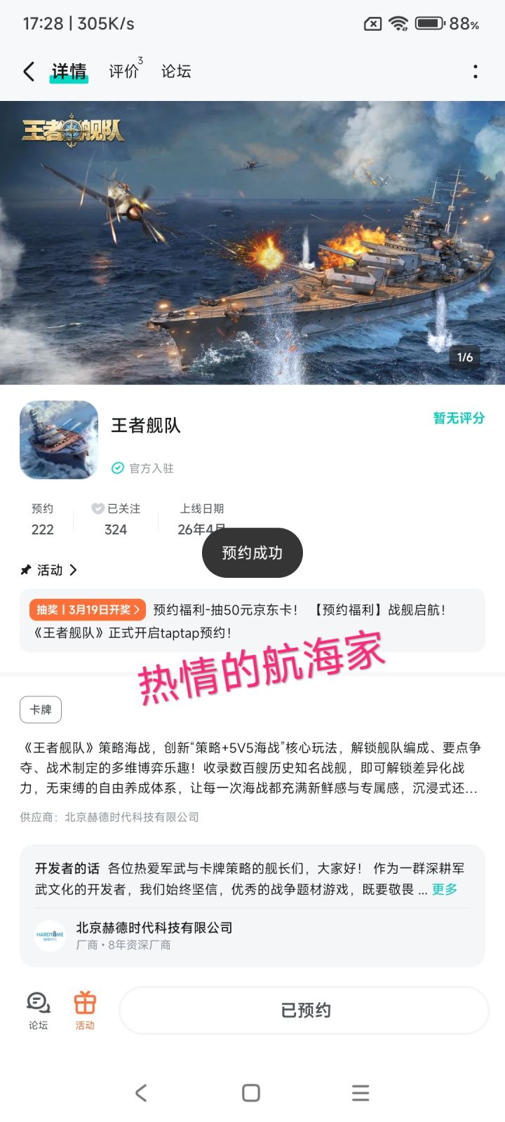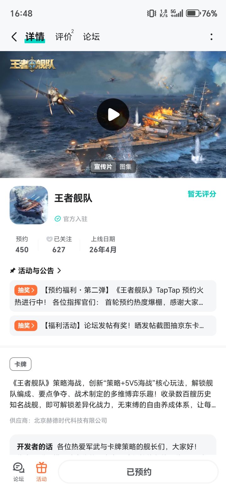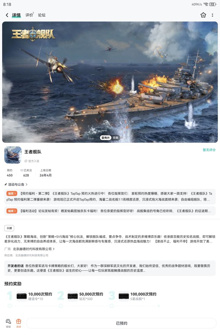 一直很喜欢二战战舰题材的游戏,《王者舰队》看着画面和舰种都很对胃口,希望上线后能还原经典名舰,玩法丰富不逼肝,福利多多,早日公测启航~