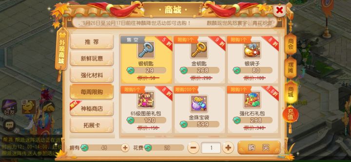 第一名:5折银钥匙比例:3元换4千~300万金,4千指人参果,300万指金钥匙再开神兽灵石。小技巧:优先选法宝精华和金钥匙多的宝箱,不行可以换地图找。下面第一个宝箱只有两个精华一个钥匙,第二个有三精华两个钥匙。排第一,不是因为有几率金钥匙神兽,而是因为体验好,大概率都是赚钱,出精华能吹一天,金钥匙能吹一个月,出神兽能吹一辈子。如果开到金钥匙,就可以开金宝箱,优先选有化灵露和神兽灵石的宝箱