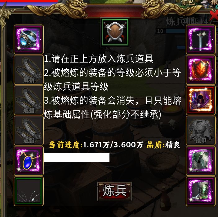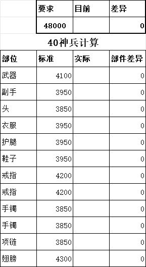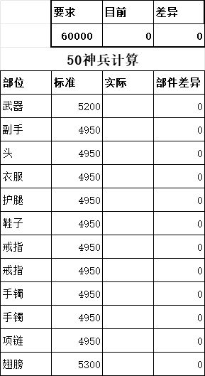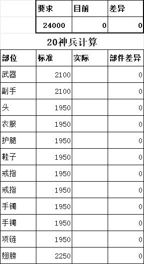 练兵品质最高为神器,评分达到满分就可以神器练兵。神器练兵提升巨大,前期可随意练兵快速升级,后期练兵要传奇以上,神器练兵掉落率最高30%。10级神器练兵最简单,背包32800钻可免费购买福利礼包,内含12件随机神器20000钻可获得神级翅膀,运气好直接神练,如果缺某部件,可花费300钻或者签到买起步礼包。补齐一身神器,进行神器练兵。具体装备评分需求见附表。可以知道哪些部件可以补分,超分可以用传奇