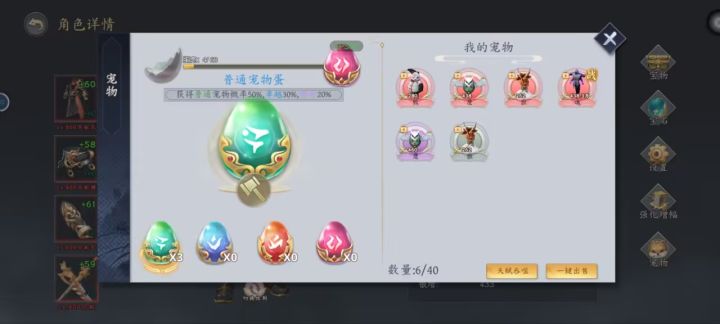 一、此篇攻略对本游戏的宠物功能进行详细介绍!首先,宠物功能在个人信息右侧底部宠物字样的按钮进入,进入宠物界面之后,你可以进行砸蛋(获取宠物)、出售、吞噬等操作,点开宠物还可以进行出战、锁定、喂养、传递等功能。其次,我们来介绍宠物各功能的作用:1. 砸蛋:需要在游戏商城中花费绑元进行宠物蛋的购买,每个宠物蛋售价1万绑元,购买的宠物蛋可在宠物界面进行砸蛋,不同品质的蛋可以获取不同品质的宠物,目前