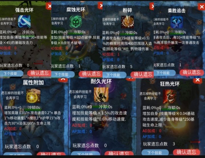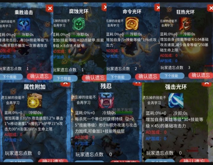 丛林肉搏玩法是八人混战T0技能:耐久光环,溜溜光环,窃取生命,重击,穿透光环,腐蚀光环,强击光环推荐攻速(耐久光环,溜溜光环)推荐控制(重击,圣剑裁决)推荐吸血(窃取生命,高级吸血)推荐破甲(穿透光环,腐蚀光环)增伤 (强击光环,命令光环)先发育为主,开局会给两次遗忘技能,先把对自己有用的技能拉满,第五波开始去商店买遗忘刷技能,有金币可以去商城买属性点。左上有树人,右下有狼人,没啥