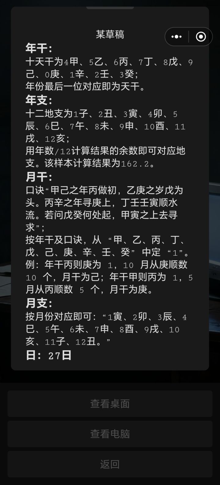 正常按照万年历,丙戌 戊戌 甲辰 丁卯,应该是1946.10.20日,而不是攻略里面的1946.9.27。首先,如果按照中国传统的天干地支算,丁卯不会是27日。我觉得作者单独做了规则,也合理,毕竟我这样算是偷懒了。然后我就去按照规则算。“用年数/12计算结果的余数即可对应地支。该样本计算结果为162.2。”我的理解是,xxxx年的数字除以12等于y…余z。举例:2025年的地支,应该是202