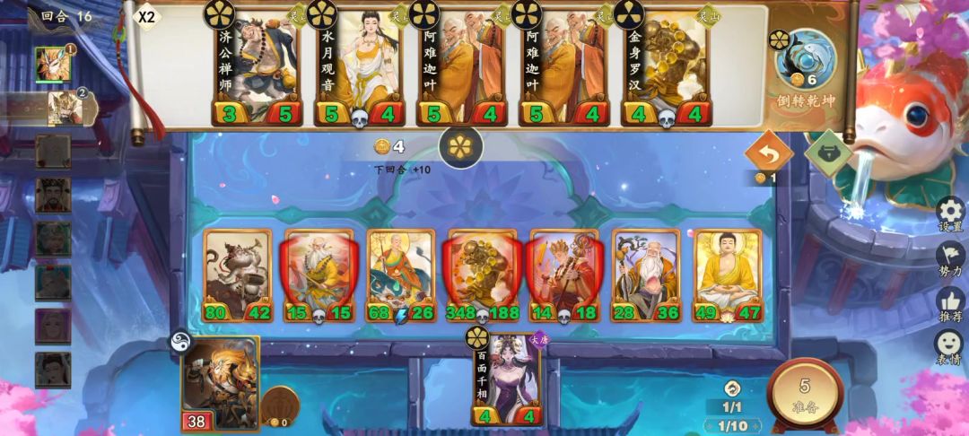 大家好,我是希拉斯。游戏昵称玖漓,ID4145834557440。 前一段时间西游斗智牌斗神旗(原来叫三界旗)更新了取经路这个单机模式,我发现有些朋友吐槽噩梦难度有些高。今天我来分享一下我个人通关思路。 在所有大圣里我觉得最简单通关的就是文财神,阵营最容易通关的是阿修罗。以下均为文财神以及阿修罗通关思路。 进入游戏后先观察阵营禁用情况。最理想的情况是阿修罗,地府,天庭,龙宫这几个没有被禁用。