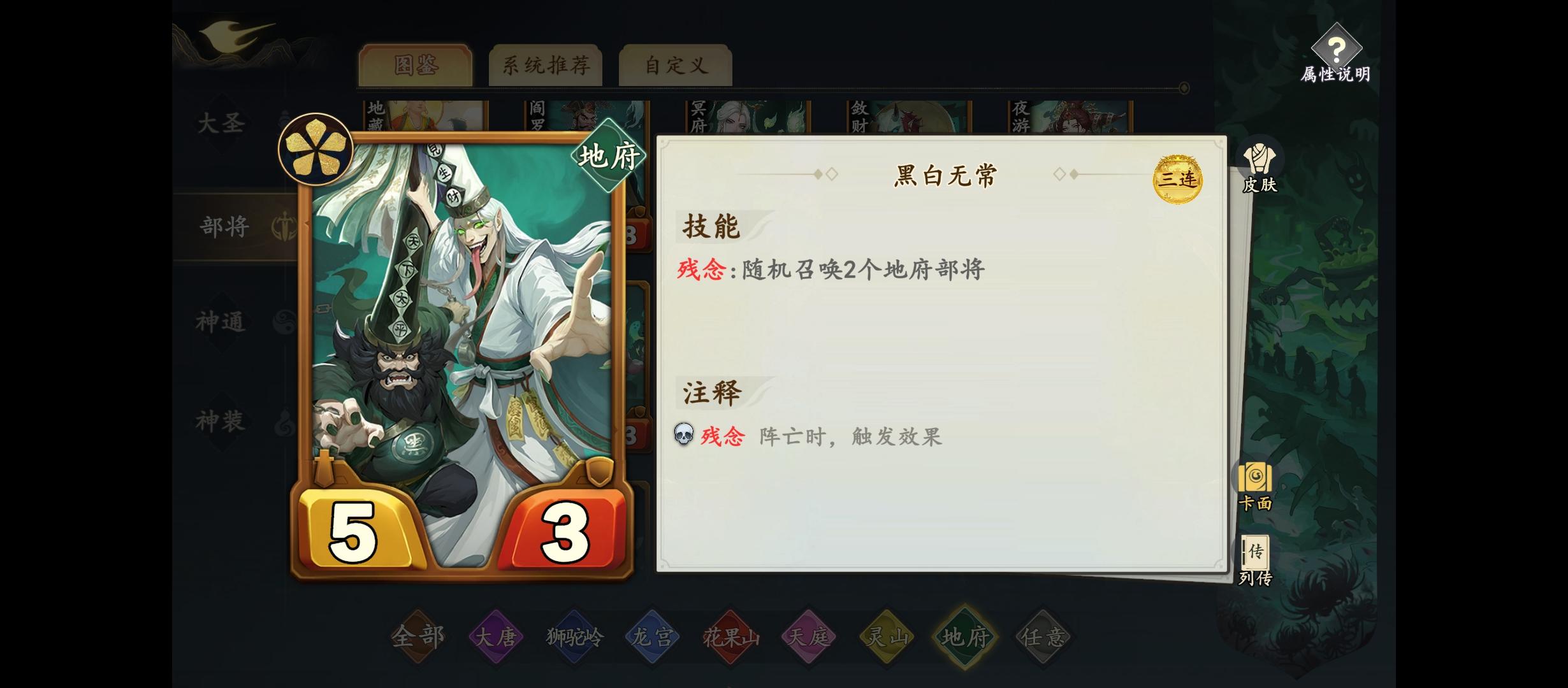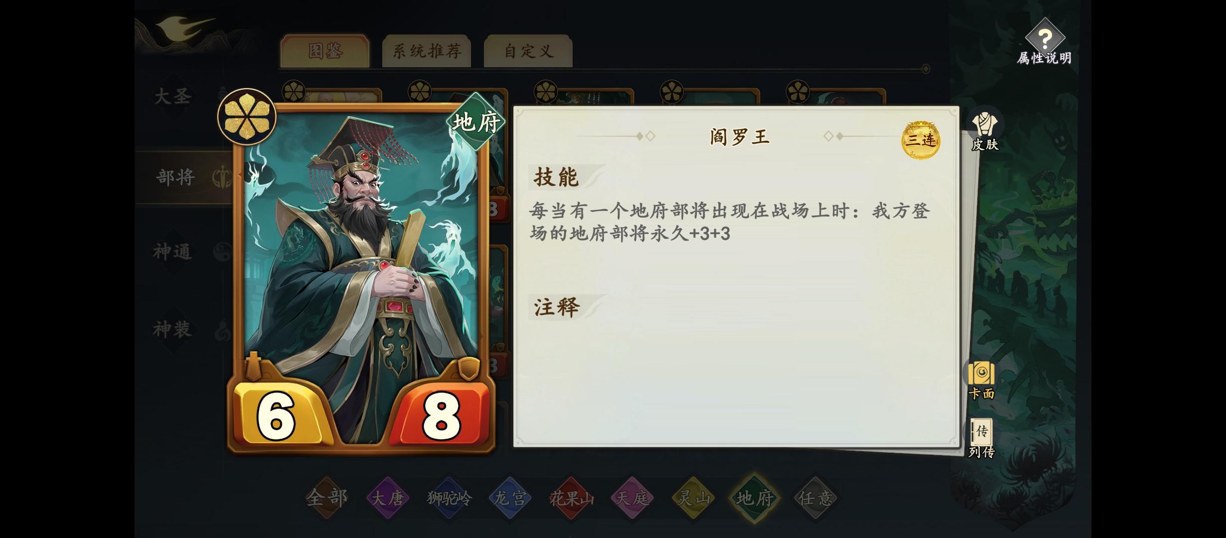 大家好,我是希拉斯,游戏昵称玖漓。在此我仅表达我个人的观点,不喜勿喷。(如果你的理解和我的观点不一致以你的为准)个人感觉目前地府很强势。目前地府核心玩法是做大判官。根据做大判官我个人总结的地府以下三套流派。第一套:地府入场流(个人起名纳头便拜):核心:阎罗王,福星,黑白无常,崔判官,敛财鬼。最佳配角:袁守城,小鼍龙。玩法:经过策划提高了阎罗王的数值,入场流变的更加恐怖。阎罗王在有地府随从