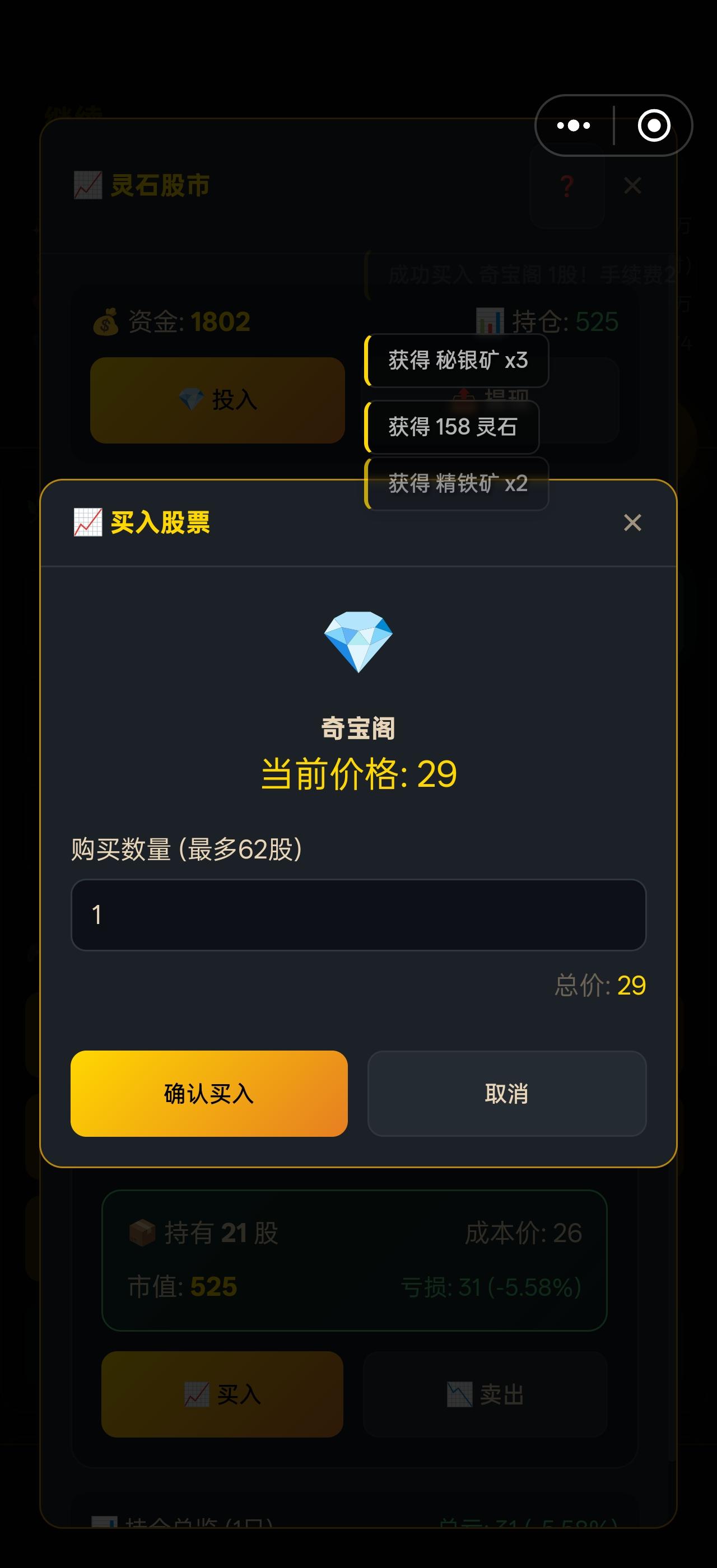 1.股市加个一键购买,不然股份多买起来麻烦2.股市提现能否加个确认按钮,不然一不小心就全没了,得重新弄3.仙侣阁可以弄一键邂逅跟合成,不然点起来太麻烦了,得点召唤,点消耗,点邂逅,再点继续,最后弄一大堆还得去疯狂点合成4.既然缘定丹-凡是用凡品灵草召唤凡人,缘定丹-灵是用灵草召唤修士,那能不能再出个缘定丹-仙用仙草召唤真人起步,这样后面就合成仙人跟神灵方便些,毕竟运气不好还合成个5-6-7阶