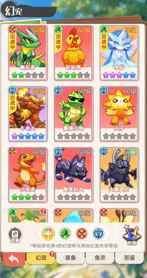 防御:老牛辅助:海精灵双攻击:火龙兽、哈鲁优先进化海精灵到2阶,加大奶量,攻击位先升火龙兽到2阶解锁狩猎光环加伤害,进化还能加大招的固定值伤害,所以都优先进化到2阶即可,随后橙色就只抓海精灵,等红色宠物来了替换掉橙色攻宠。基本思路就是这样1-50不充钱有点难打,不想凹的就6元小火龙稳过,不充钱就上主角技能重伤,然后赌脸BOSS少触发或者不触发回血,要不就挂机等资源再打,过了1-50之后会舒