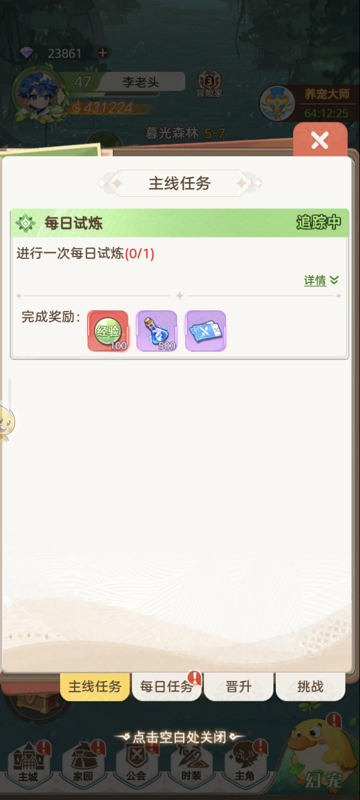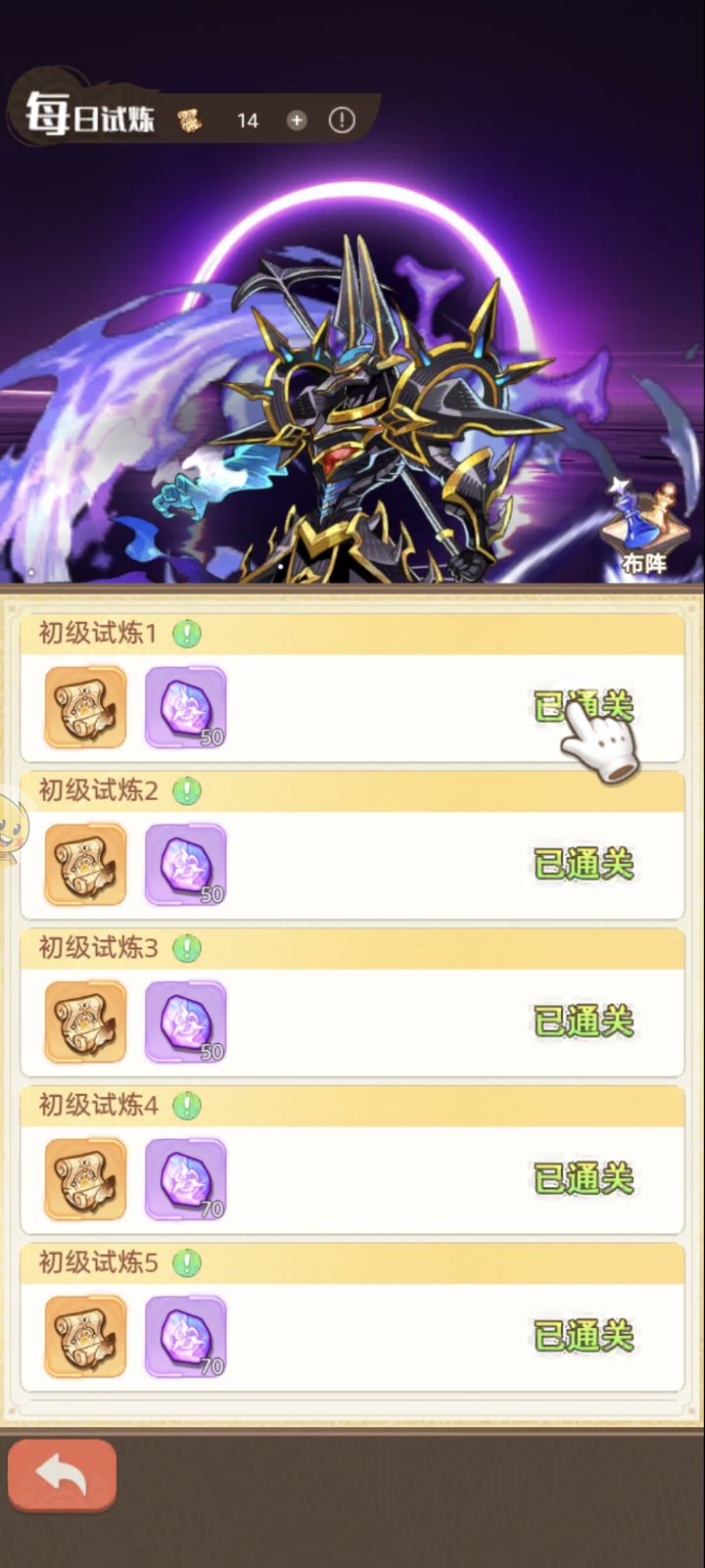 卡在主线任务上,按照指引,他会一直让你点击初级试炼,但是你已经完成了,所以你怎么点击都不会有反馈的,退出重新进,用一次扫荡,系统也不会完成,就算你往下滑,想要点高级试炼,他也会一直刷新回初级试炼的界面