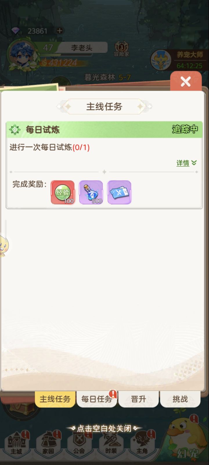 卡在主线任务上,按照指引,他会一直让你点击初级试炼,但是你已经完成了,所以你怎么点击都不会有反馈的,退出重新进,用一次扫荡,系统也不会完成,就算你往下滑,想要点高级试炼,他也会一直刷新回初级试炼的界面