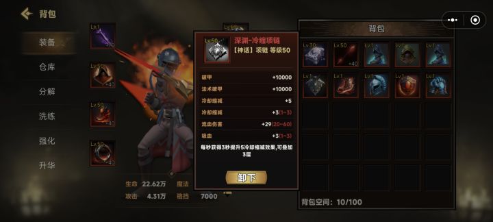 如图三件装备(副手随便换个凑CD的装备都可以),其余部位我用的是暴击套装(方便切换弓箭手暴击对于所有物理系英雄都可以使用)。词条方面洗冷却缩减+3即可凑到80CD就可以无限利用焰刃大招挂机过普通图(mini版死骑被动)四时秘境配合其他三人也可以达到秒刷效果效率嘎嘎高。以上装备如果你能凑到80以及100CD都可以替换掉然后白嫖的游戏就到这里结束了,生存本领主本不是你我这些凡人所能触及的