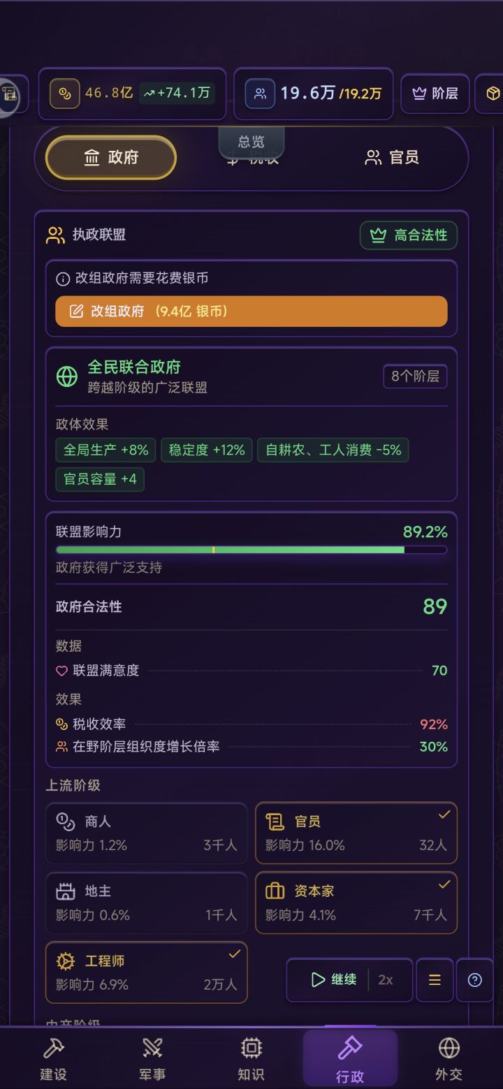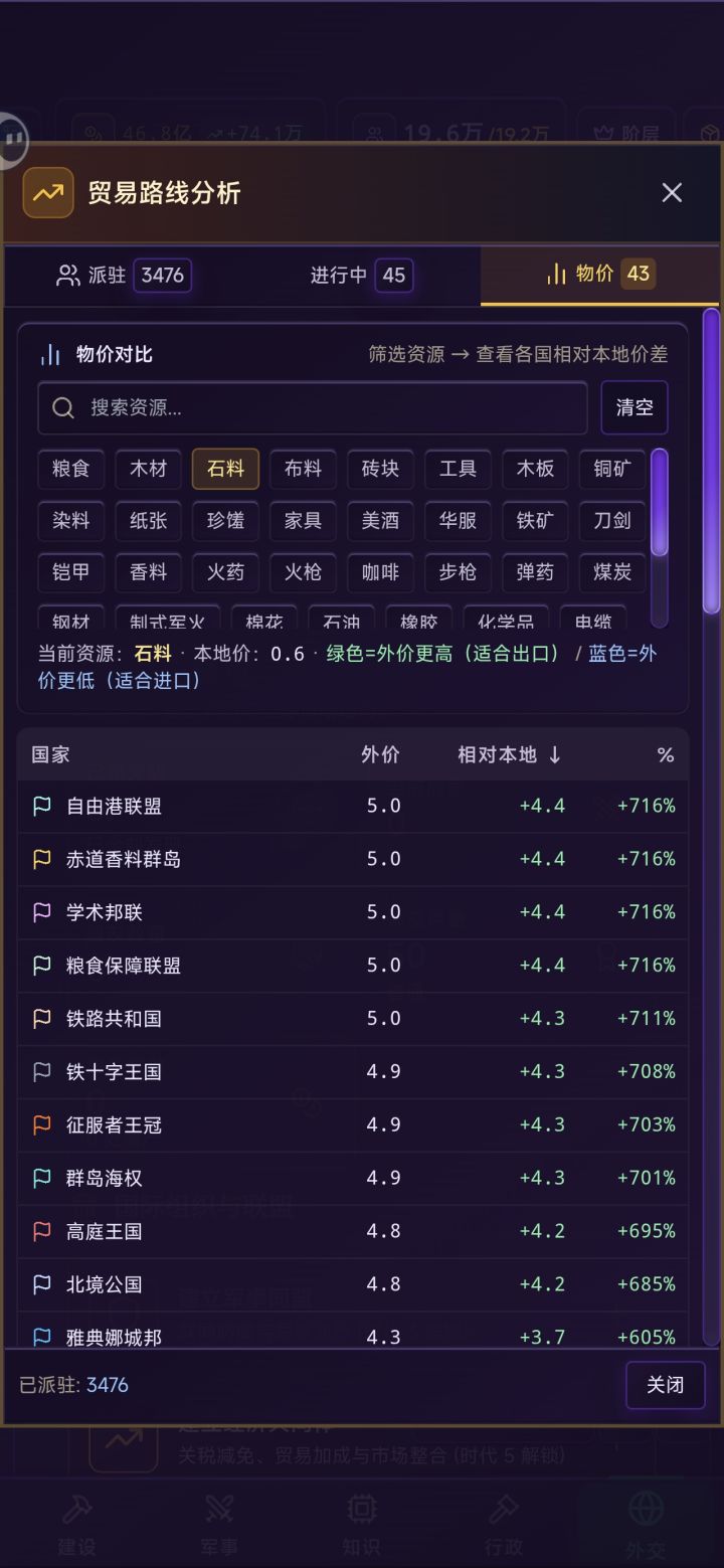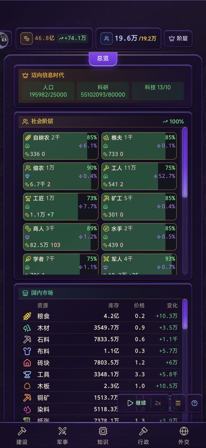 好处就是后期发展巨快,不缺资源和钱,随便点如图所示1.十年跃迁3个时代2.合阶层稳定,资源丰富3.金钱和生产双循环上升4.政治高度稳定(军国+1神)5.外交50+联邦全100%满意度6.随便一个商品对外基本都是倾销状态7,可以看到我资本家和工人是主力(前期就是商人,地主,农民)8.养个几千的小军队完全没问题(没有对外战争,养着主要为了前期镇压叛乱)新手可以借鉴我这套打法,我也才