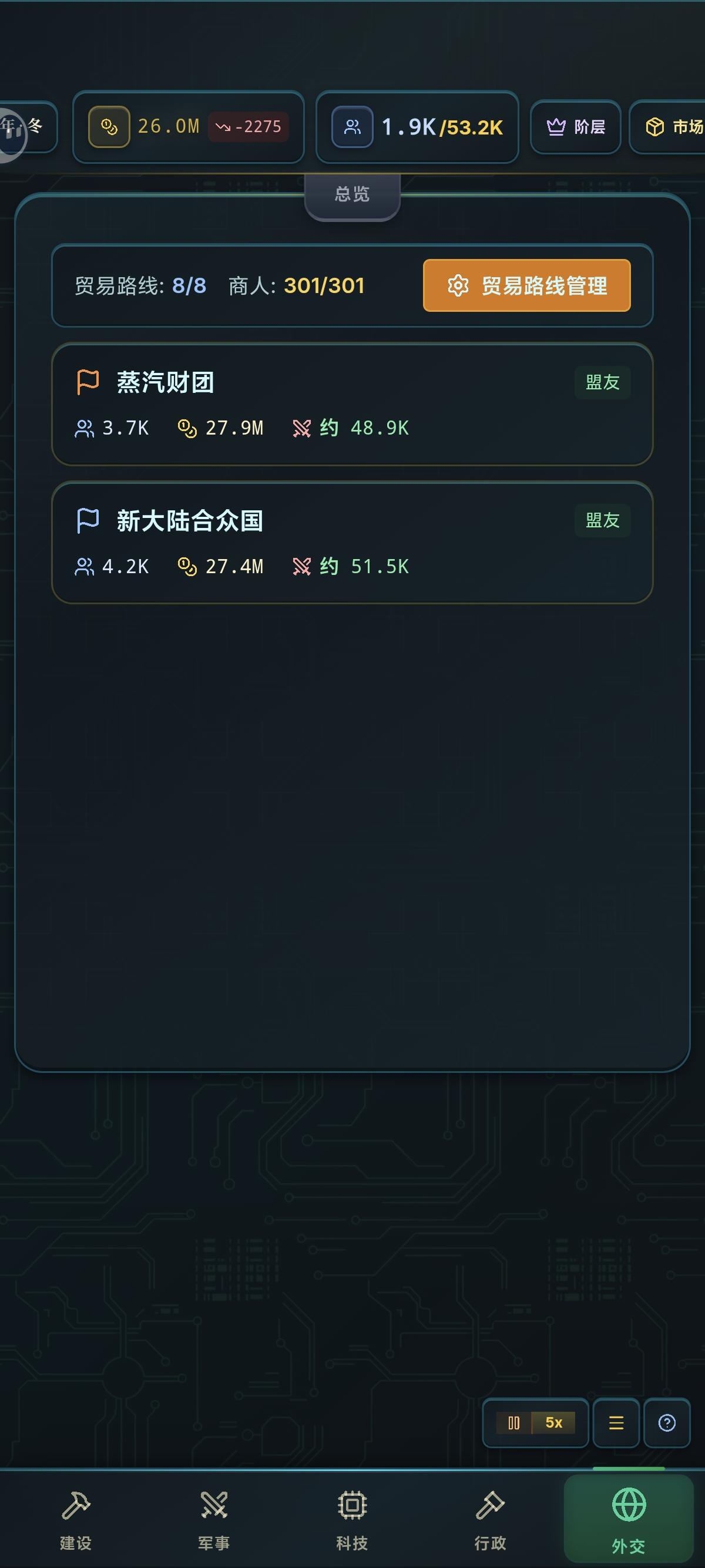 保障粮食木材及衣物,其他的按需建设,进入第二阶段开航海术将全图打一遍,达到50战争度直接领人口。经济发展饱和后进入第三阶段,将主军事的国家逐个打到吞并,同时将失业者人头税拉满,避免失业者堆积侵占粮食和暴动。战争期间的反政府组织直接打服,拿修养生息buff,打到全图没有军政府组织的时候多建立通商路线,很快就全图结盟成一块铁板,并且不会发生战争,此时将军队清空,保障各阶层满意度即可。庄园等旧时代建筑该