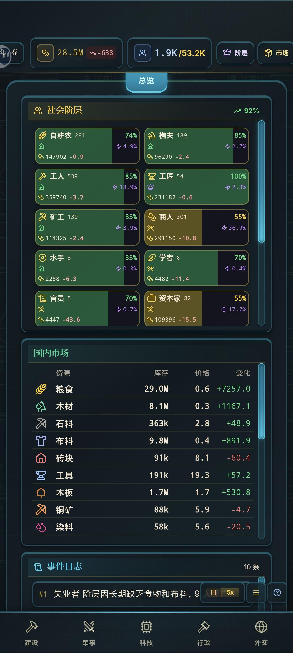 非经济学专业,看不懂文明百科里的各种公式,略懂一点历史,给玩不下去的朋友们提供参考🤓👆思路是不解决经济危机,不管物价,靠战争转嫁矛盾,索取巨额赔款补贴国内阶级、补贴生产。用税收和战争财升级建筑投产。目前只玩了简单模式,玩到封建时代1️⃣开局优先发展生产,把基础建筑都点出来,确保没人失业,税率不要动(人头税不超过5)2️⃣有阶层影响力扩大,就让他们加入执政联盟,优先保证合法性3️⃣不用着急