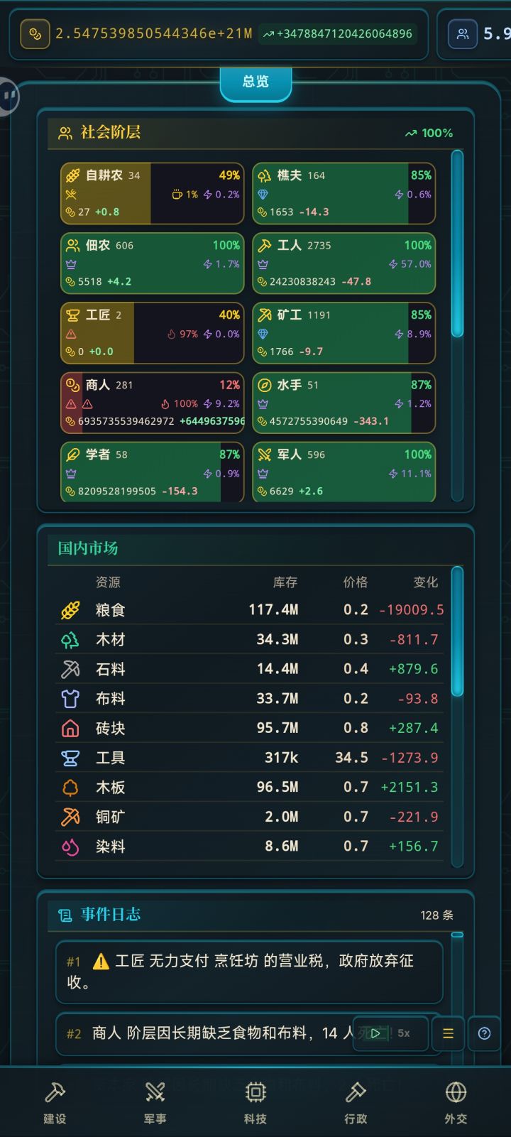 税收:开局将将所有商品的交易税拉到20,后面解锁一个商品拉一个到20。这样就不会缺钱。建设与市场:建设是为了更好地满足市场需求,你要保证市场中的每个商品数量都在增加,特别是食物和布料。 简单来说,哪个价格高了,数量少了就建哪个的生产建筑。具体价格是高是低可以去与其他国家对比。军事:一个兵都不要,有人打就求和,然后再送礼。贸易:只进口不出口,因为我们是高税收,所以我们不缺钱只缺资源,有资源就
