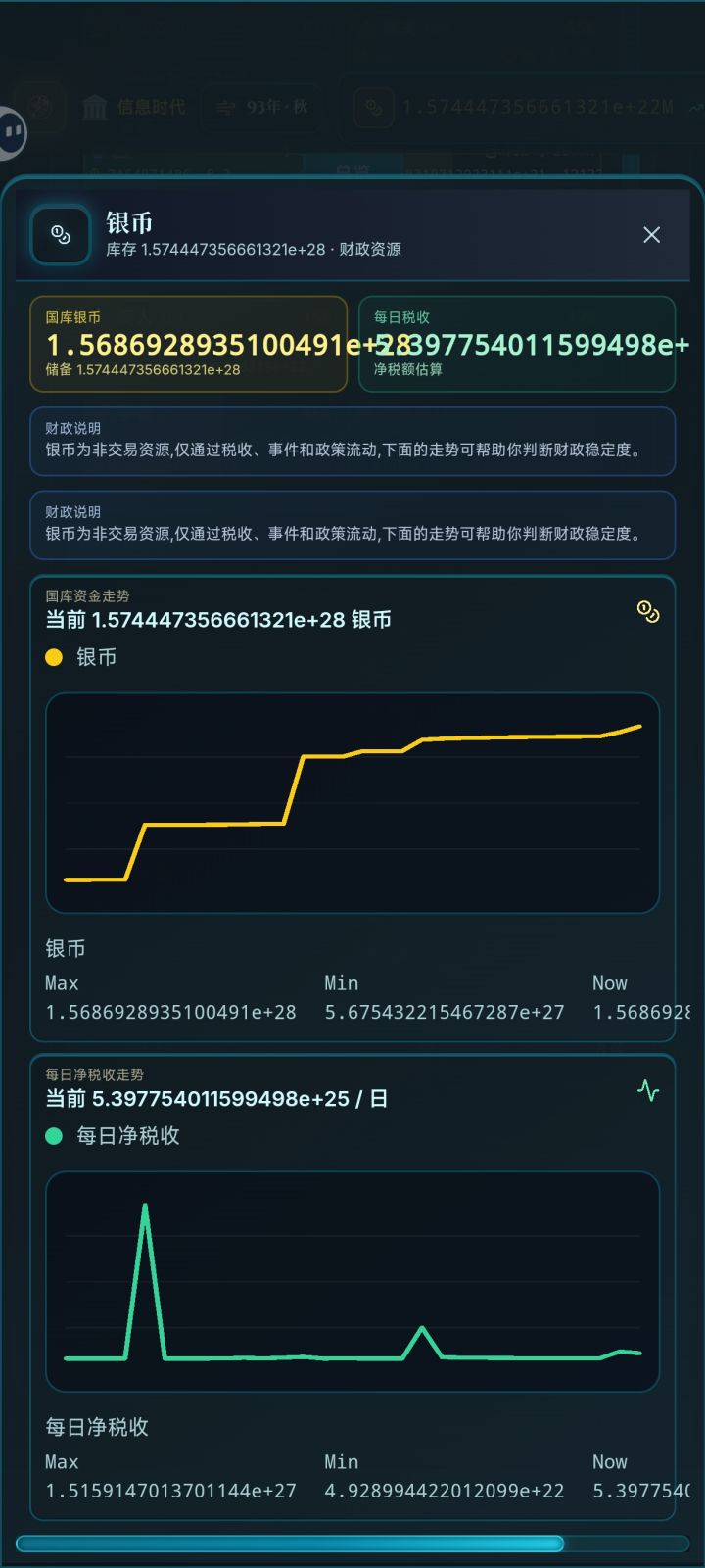 如图,不知道怎么形容,自己看吧,这么玩很容易崩,我玩了不到一分钟就给改回去了,不仅能充盈国库,还能削减物价,效果很强