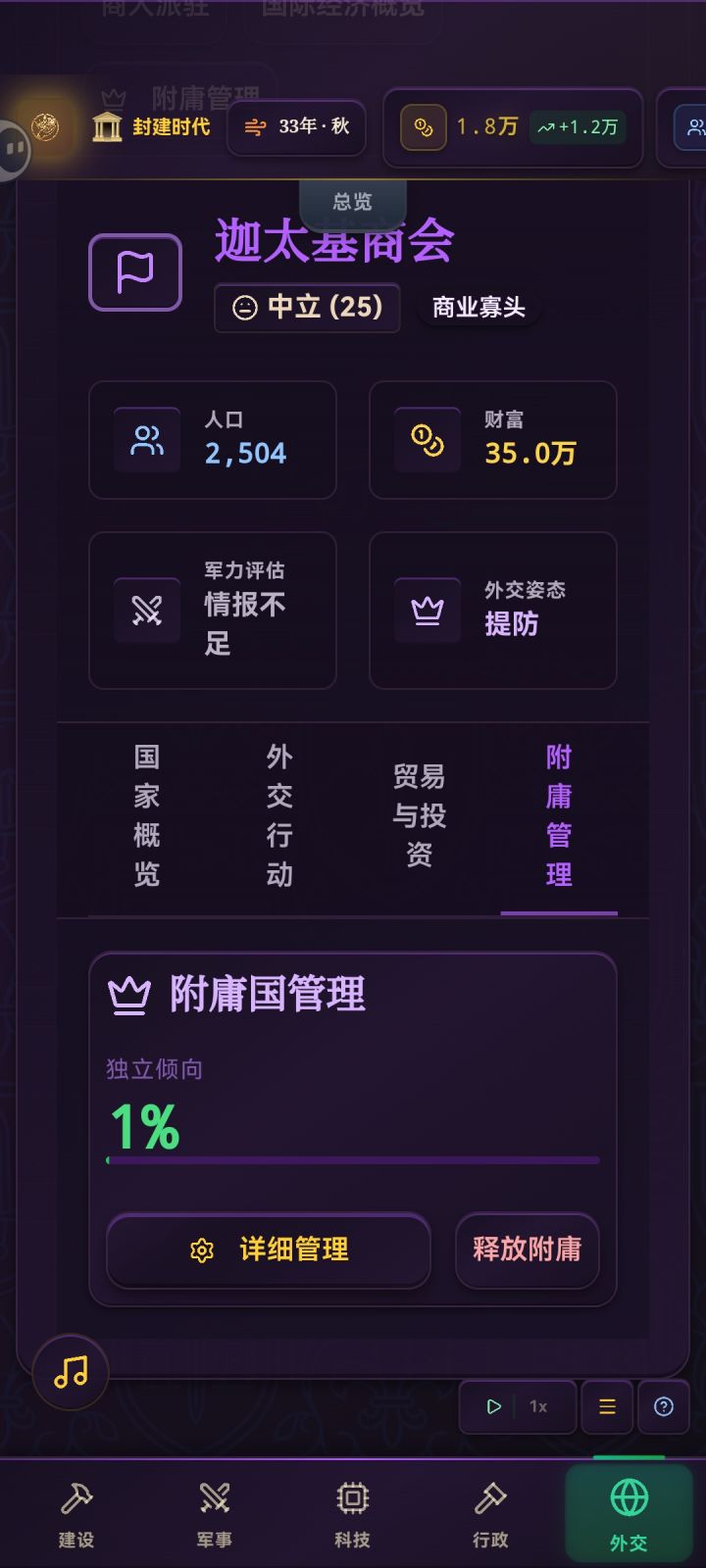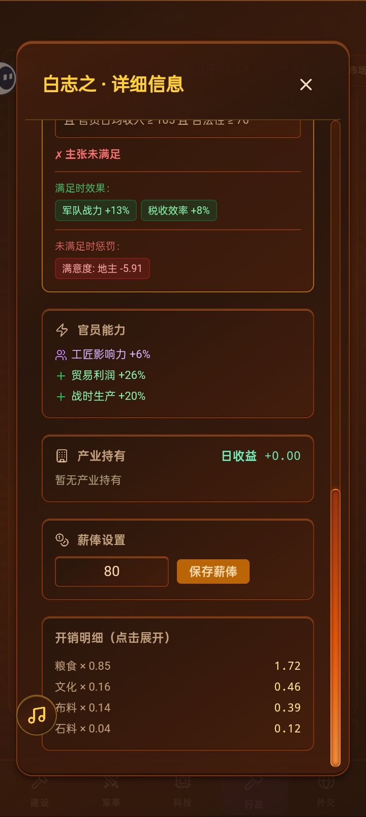 1,地主补贴我都拉到-1000了,还是没人干,导致好多要地主的设施全都生产不下去 2而且建议选项的时候不要流时间,尤其是打仗和做外交政策的时候,弄完的话时间都过好几年了, 3后期国家也是抽象,有的发展也太快了,战力都崩了 ,而且那个建筑升级我觉得做的也不合理 ,明明没增加多少东西,结果升级那么贵 ,不如不升 4人员满意度也奇怪,有的一年工资盈余500,1000多的人家满意度还下降 ,有的工资天天倒