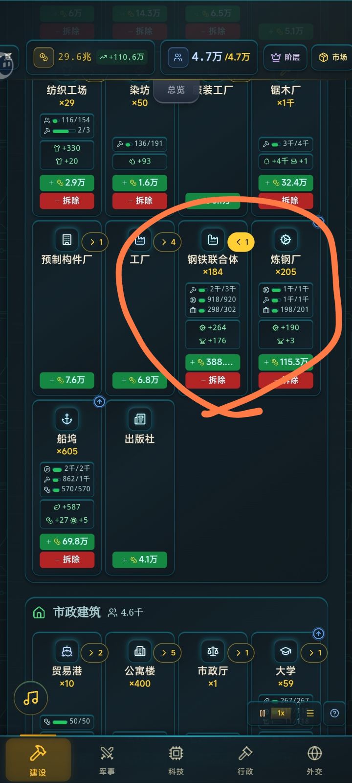 作为高一个时代解锁的炼钢厂,为什么在建筑界面上不是默认展示的呢?比如砖头,最后解锁的预构件厂就会在第一位,展开才能看见前几个时代的砖头产业。