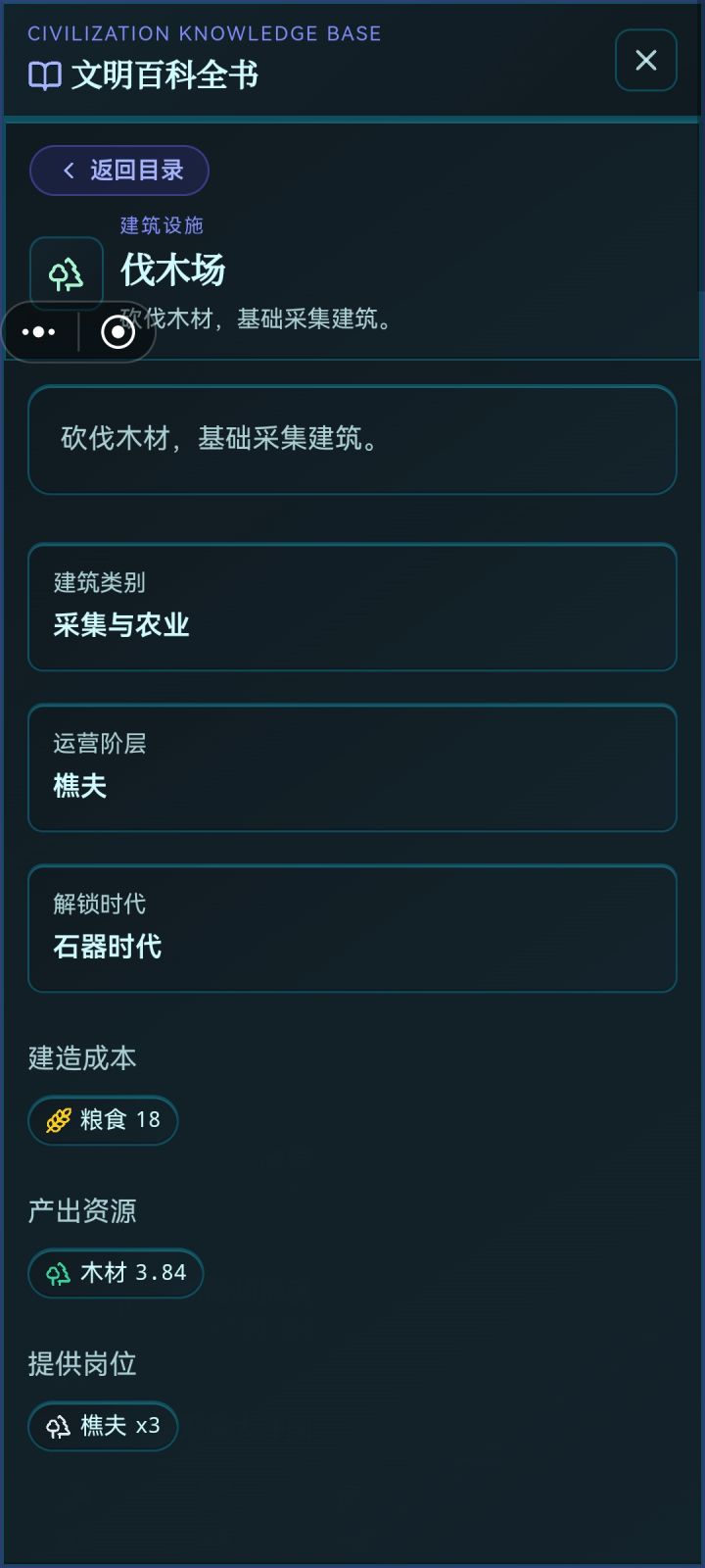 这是石器时代伐木场,这是工业时代伐木公司。呃,看造价,看单位产出,看消耗,呃……那为什么不多造伐木场呢?还有好多的建筑仔细一看一言难尽,起码数值要符合时代进步吧。。