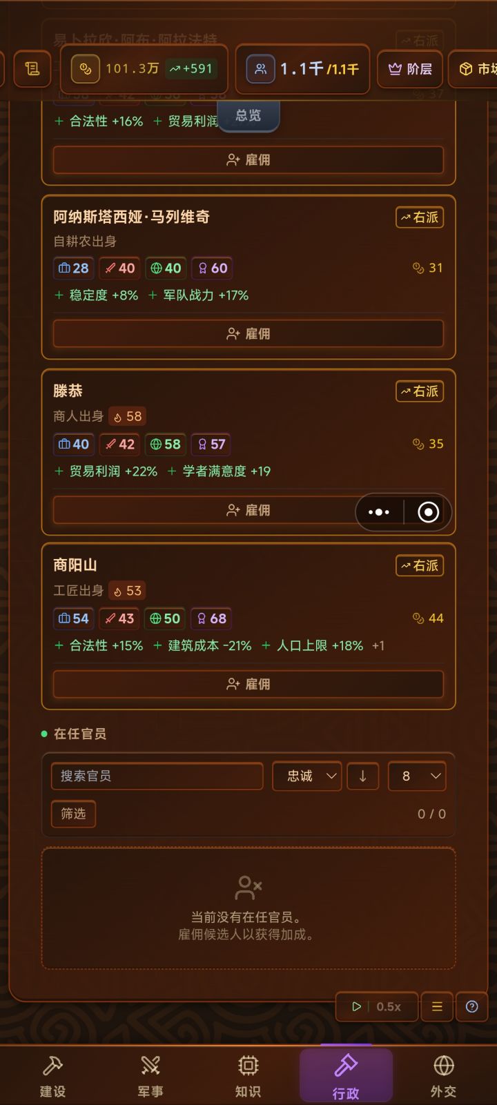 1,地主补贴我都拉到-1000了,还是没人干,导致好多要地主的设施全都生产不下去 2而且建议选项的时候不要流时间,尤其是打仗和做外交政策的时候,弄完的话时间都过好几年了, 3后期国家也是抽象,有的发展也太快了,战力都崩了 ,而且那个建筑升级我觉得做的也不合理 ,明明没增加多少东西,结果升级那么贵 ,不如不升 4人员满意度也奇怪,有的一年工资盈余500,1000多的人家满意度还下降 ,有的工资天天倒