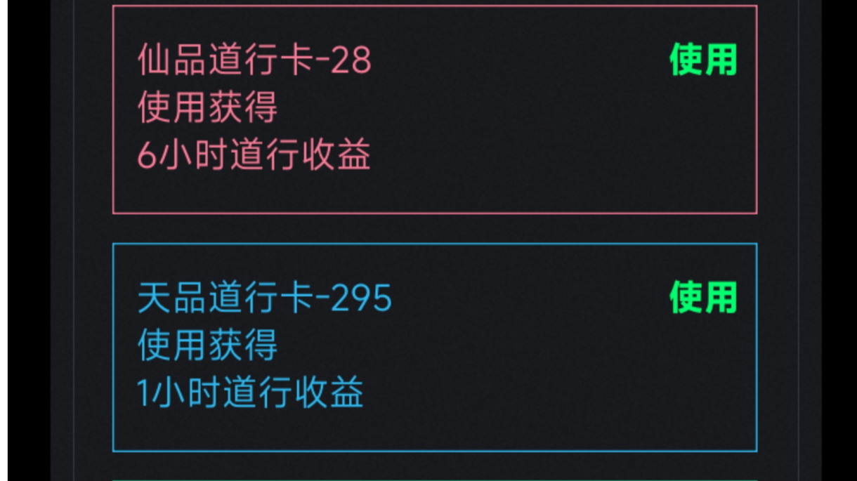使用道行卡时需要注意点击使用时会显示最大值的道行卡,千万不要手快一下就点击使用。使用道行卡方式:可以计算一张道行卡所获得的道行,后用一张低品质的道行把层数升到其所能升到最大层数,然后根据后面所需要的道行,合理的使用道行卡。尽量不要使用完所有的道行卡,需要留一部分的道行卡用于转生后存道行用。尽量不要在一个大境界内使用太多的道行卡,而导致后面的大境界没有道行卡用