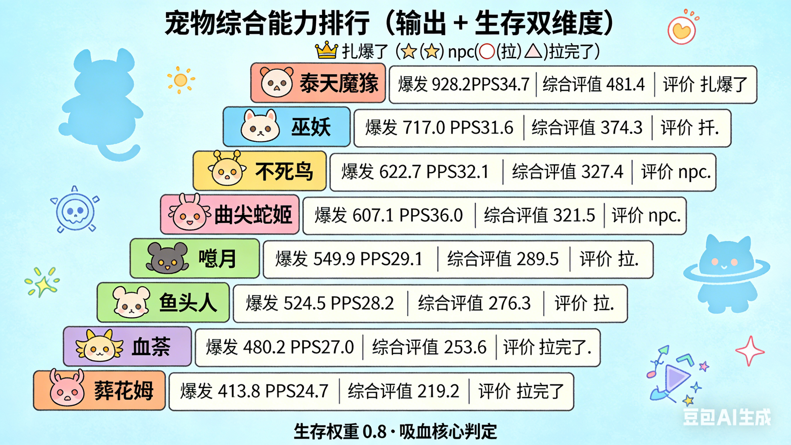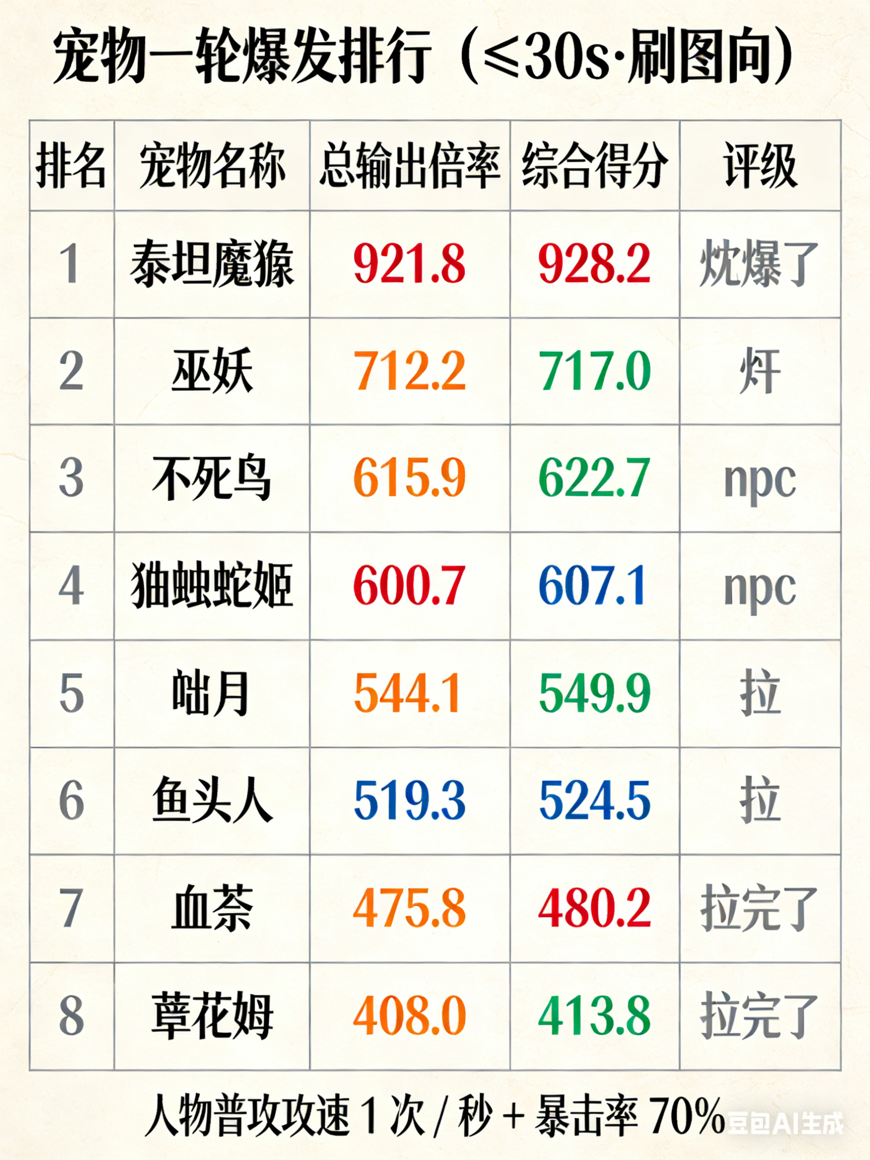 玩了六个号体验了一下新版本宠物。说明一下,模拟的平时刷图打BOSS的情况:暴击率70%,技能一释放就进入CD,放完后等1秒才能衔接下一个;宠物控制时,有一个伤害1攻速1的人物帮忙普攻。宠物释放技能的僵直时间也算上去了。一轮爆发排行(≤30s,高→低)泰坦魔猿:总输出 921.8 倍率 | 综合得分 928.2 | 评级 夯爆了巫妖:总输出 712.2 倍率 | 综合得分 717.0 | 评级