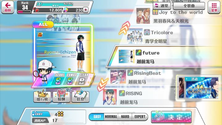 1.打歌有分数,连击,通关次数三个记录,点击报酬即可查看,继续点击达成要求可查看具体报酬点右上角图标可以按要求筛选歌曲,方便清未达成s的歌曲或选某一颜色的歌曲方便配队和做任务(筛合唱的功能基本没啥用,可以忽略)右上角图标还可切换通常,限定和活动歌曲。通常就是常驻歌,等级提升,剧情获得,活动获得歌曲也被添加进这个曲库。限定歌曲每月一换,不知道第二年会不会重复(大概率会)。活动歌就是活动时出现的