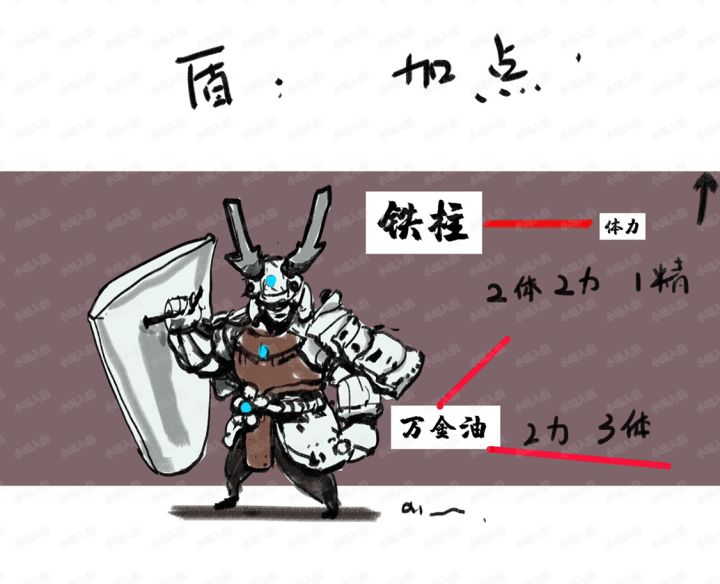 属性点:剑盾职业,图片里我介绍了两个大流派,“铁柱”和 “万金油”。这两则的区别就是前者纯防御,安心做一块铁板;后者是对pvp杀人还抱有一点希望,所以还是忍不住加一点点力量~这两种,我个人选择了铁板流,因为这种纯粹的玩法和我玩重斧是一个道理,第二种也不是不行,会比较平滑,都能干,但都不精通~铁柱:技能加点是全体力(我自己就是这么玩);万金油:【1】. 2力2体1精, 【2】.2力3体宠物推荐,生