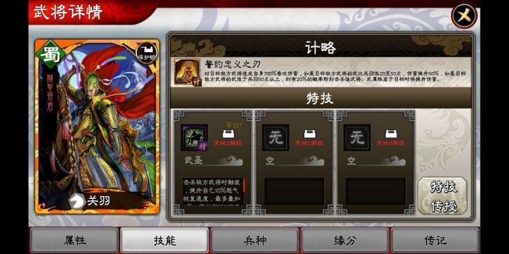 各位主公好,本篇为大家简要介绍一下游戏中的武将特技。在《三国志大战》中武将分为“绿卡、蓝卡、紫卡、橙卡”,武将特技作为《三国志大战》中核心玩法之一,紫卡以上武将均有3个特技,武将初始默自带一个特技,剩余两个特技槽位会依据武将突破等级解锁。达到突破条件解锁特技槽位后,特技槽位是空的,可以通过特技传授,选择需要的特技进行传授加强武将卡的战斗力。【特技传授】规则:1、通过特技传授可将武将特技移至