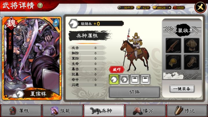 大家好 我是三国百晓生,在后续的攻略中,我将会给大家带来三国志详细的武将介绍。今天我们先来看看三国名将——夏侯惇先来看看夏侯惇的整体属性界面:可以看到夏侯惇整体属性中以武力值最高,达到91三国武将:夏侯惇武:91智:62德:76统:89运:83计略:独眼咆哮搭配兵种:骑兵特技:底力兵种搭配:缘分以及宝物搭配:主要搭配:典韦 曹操宝物搭配:玄冰玉鼎 孙子兵法 鬼角眼带好