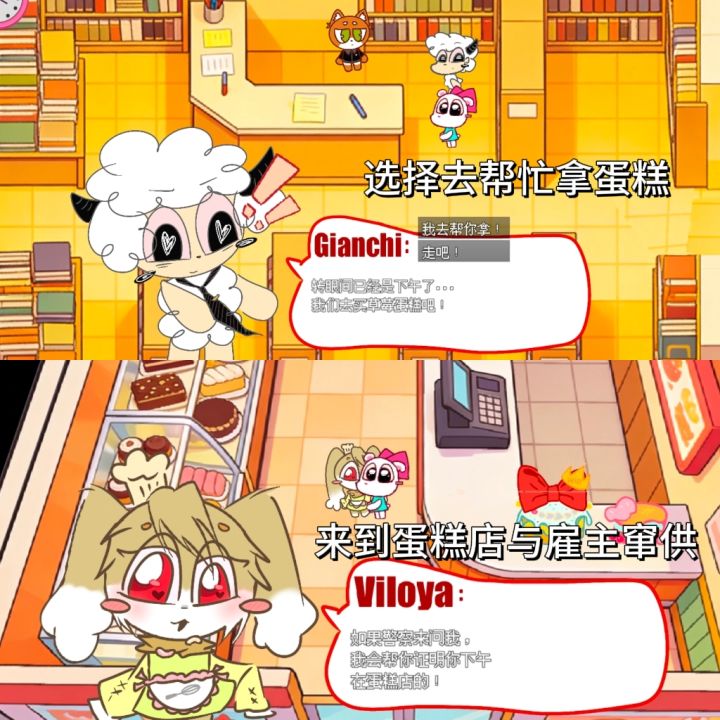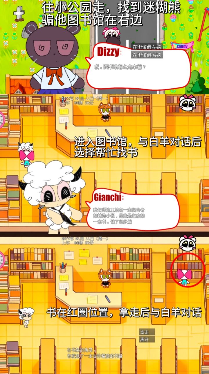 1.依旧是点台子可以和橘猫对话买武器(公司里)图书馆在大街最左侧 人物和进入门的触发都是要点下面的区域2.小羊在大街上直接点对话就行 然后再跟着小羊来到最右侧的蛋糕店(大街)然后点小羊对话然后选草莓对话完来图书馆在帮小羊拿书3.在帮小羊拿完书之后 小羊会说要蛋糕 然后选帮他就行然后再去蛋糕店和店主对话 4.然后再回来图书馆的路上有行人 不要被碰到就行 可以直接从下面的路绕到图书馆那边 进图