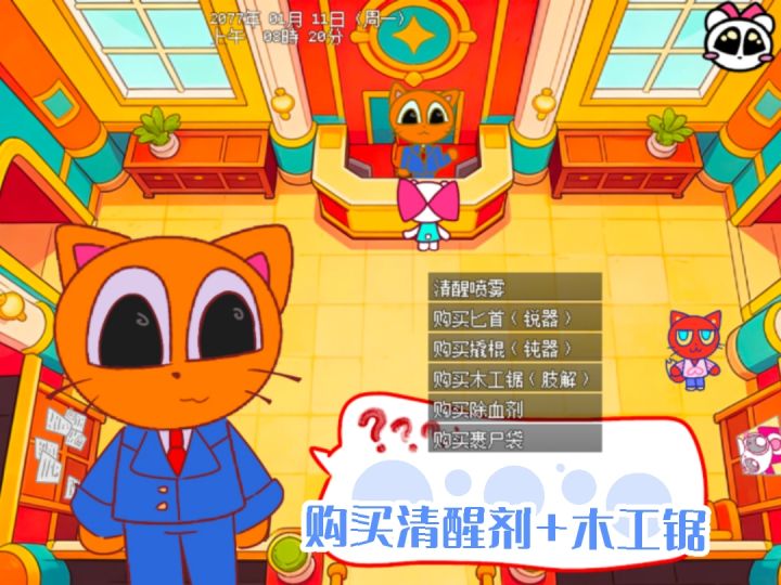 1.三周目可能会有些地方有bug Bug可以反馈给游戏作者 有建议也可以给作者 三周目更新不久2.本周末需要购买一个刀 (杀配角那被改了需要购买裹尸袋) 遇到图三中的粉色星球大厅娃娃选撕开即可获得10马诺币 然后就有钱可以购买3.用绿色笔圈的位置 都是一些触发交互点 黑猫会原地兜圈子 有一点难触发对话 多点几次就可以4.还是挺简单的 一周目和二周目没玩的 可以直接跳到三周目 进入游戏中的那个