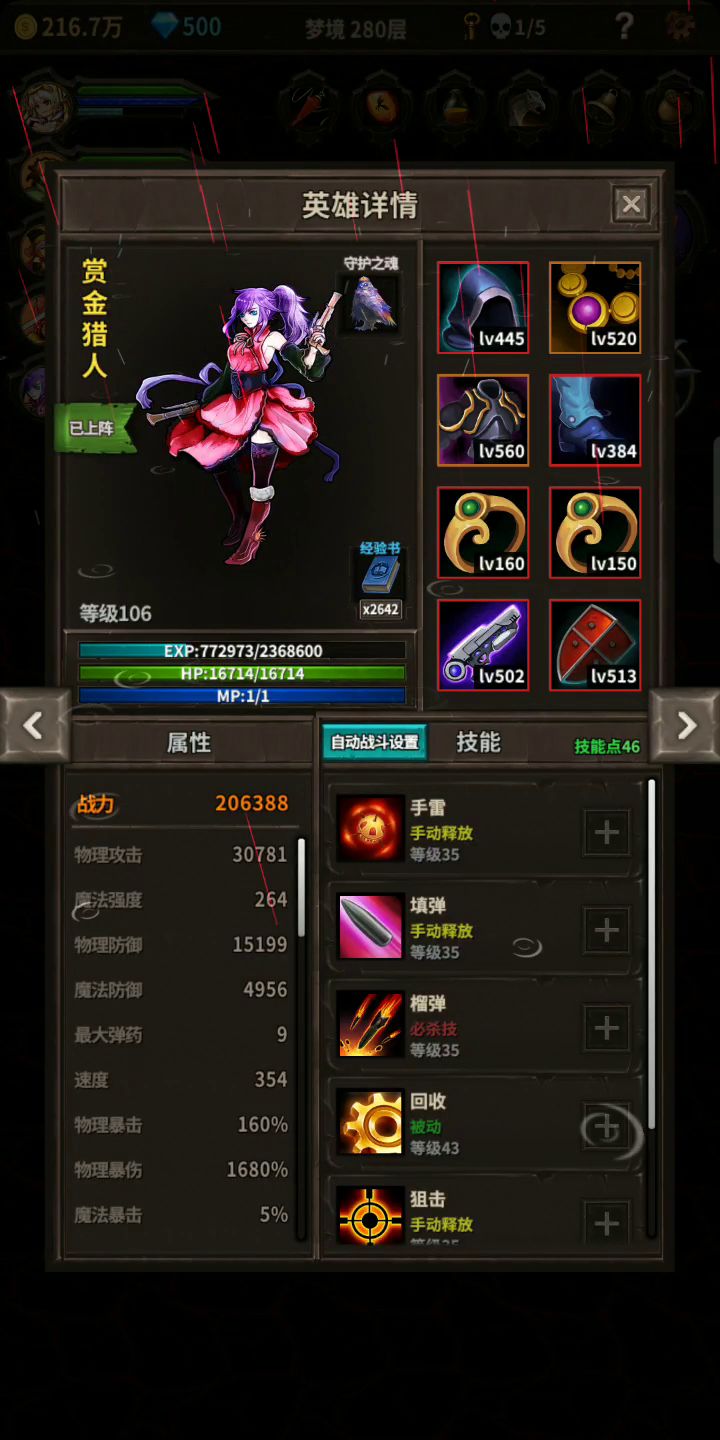 本来有个三星精灵的压制,后面出了一个带净化压制的三星精灵,于是就合成了,梦境不好打就硬钢BOSS了,费了200多钻,半血BOSS就变了,王女一招死,还是驱魔抗住的,全靠赏金的三技能一下10万,一下10的打过,太爽了,太爽了,而且勇者项链还爆出来了,105级。