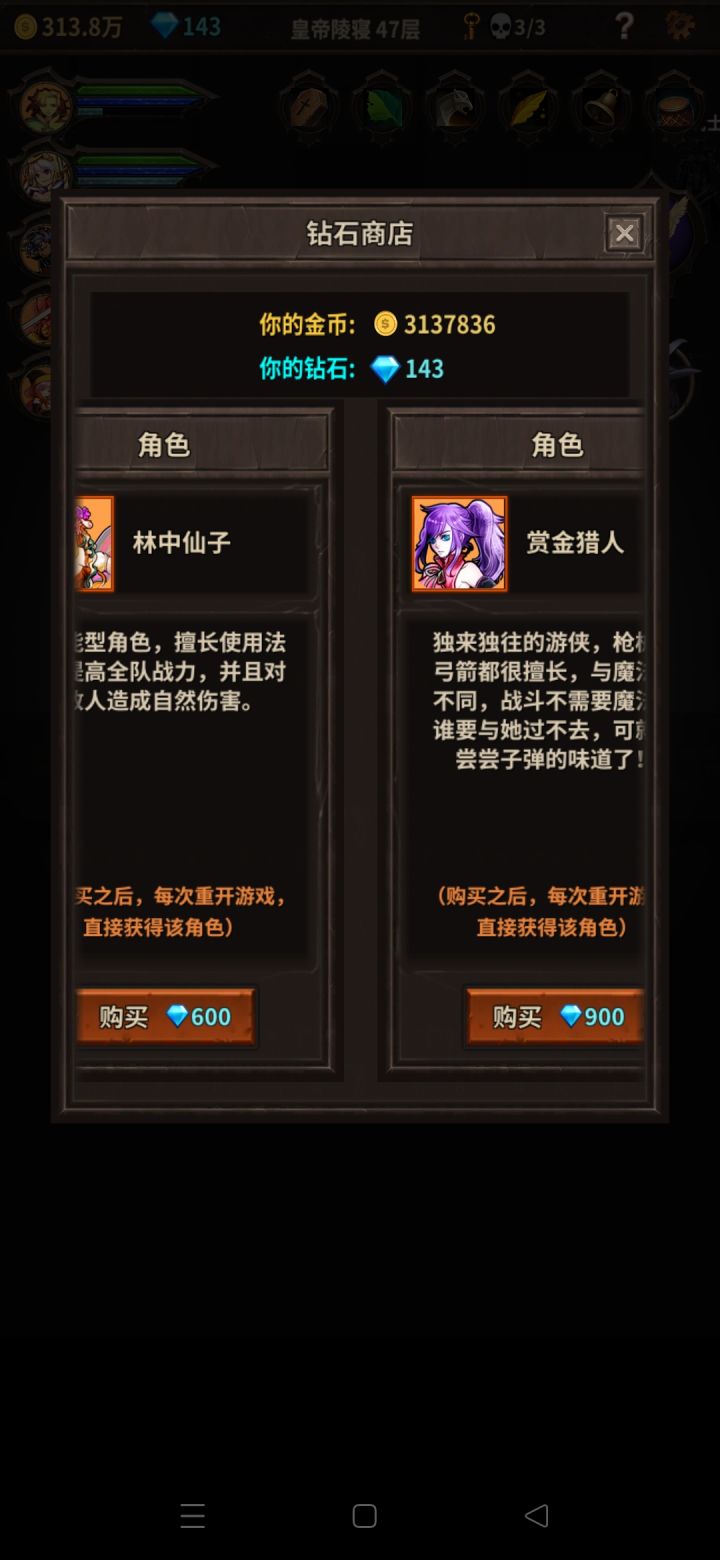 1、钻石前期会觉得难赚,开局要么推图到死个两次,随机金怪,两三次也能买刺客了,这个人物可以用到永久不下阵,之后把守护全阵容都装上,前期有什么装什么,守护宝珠一样随便装,前期你没得选2、35关是一道坎,熬过了,你可以在36关刷个几小时钻石,最好直接刷够600钻买个王女,或者狂战,我先买了王女,上阵后直接一路推到50关,中间没卡过关,不过因为装备不好后面打的真心慢!刷钻就是进图跑一圈,有金怪就打,没