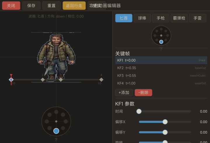 角色攻击动画,同样还是2d像素动画,对ai的美术不满意,那就自己做!整个编辑器,给上你的游戏需要的动画参数,不同武器的不同效果,都告诉塔啦啦,生成一个攻击动画,受击动画,参数自己调,比如角度,坐标,通过关键帧来实现。下面是编辑器的预览图。