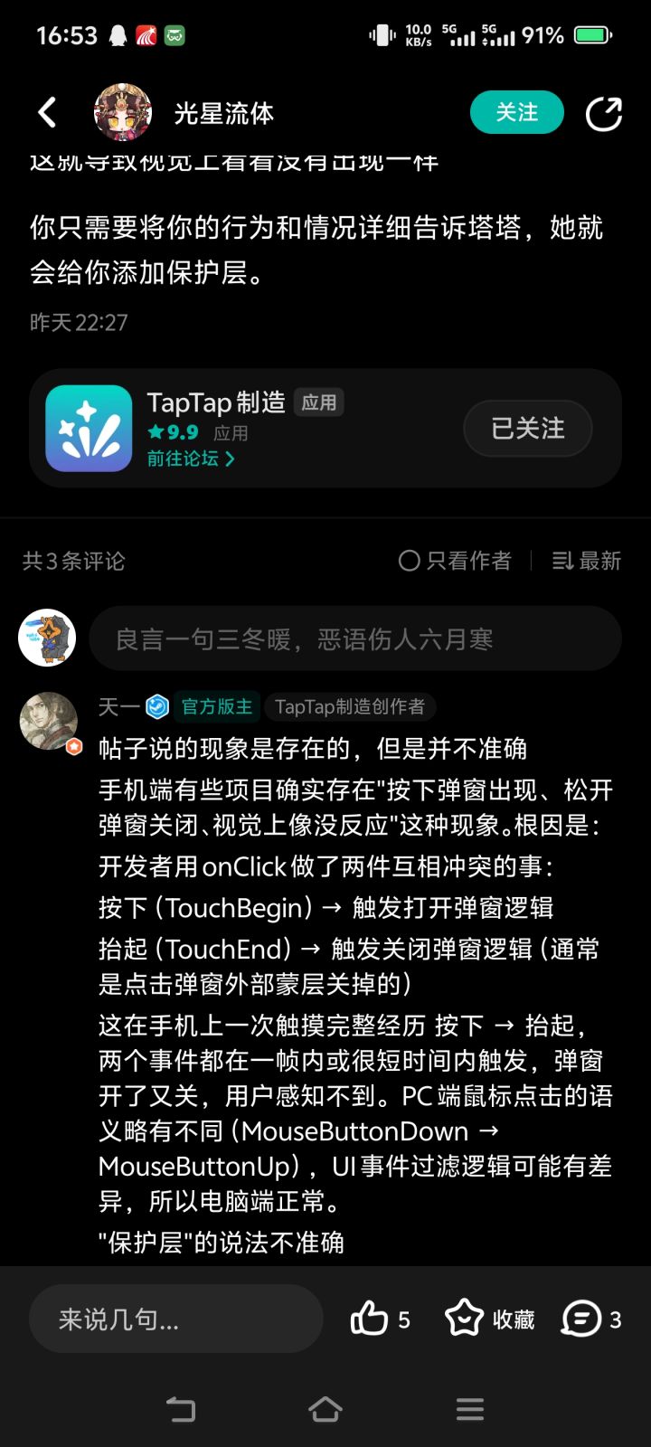 作者:琋琯的攻略机#开发心得 #taptap制造 开发引擎:TapTap Maker (UrhoX)一、问题背景手机端点击按钮打开弹窗时,弹窗刚出现就立刻消失了,视觉上像是没反应一样。而在电脑端,这个问题却不存在。刚好今天在论坛看到天哥回复了相关内容,于是炼化天哥的仙道潜力发帖。二、问题分析根因分析开发者用 onClick 做了两件互相冲突的事:按下(TouchBegin)→ 触发